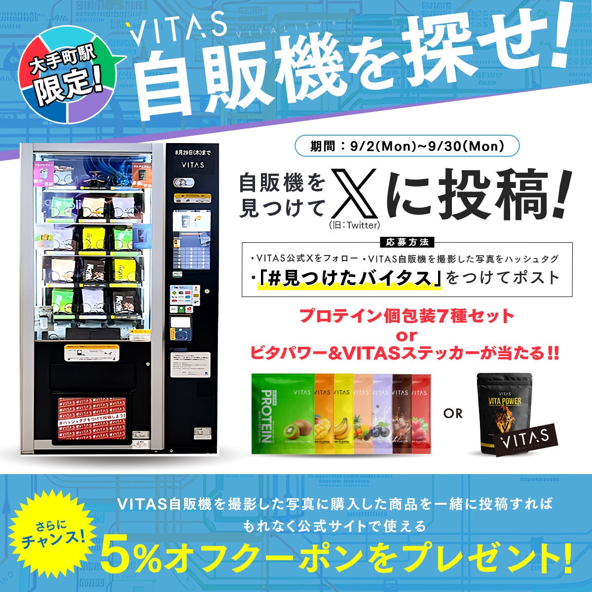 フィットネスブランド「VITAS」を運営する株式会社スリーピース(本社:東京都豊島区、代表取締役社長:高橋達也)は、9月2日~30日の期間、東京メトロ大手町駅構内にプロテインの自販機を設置します。