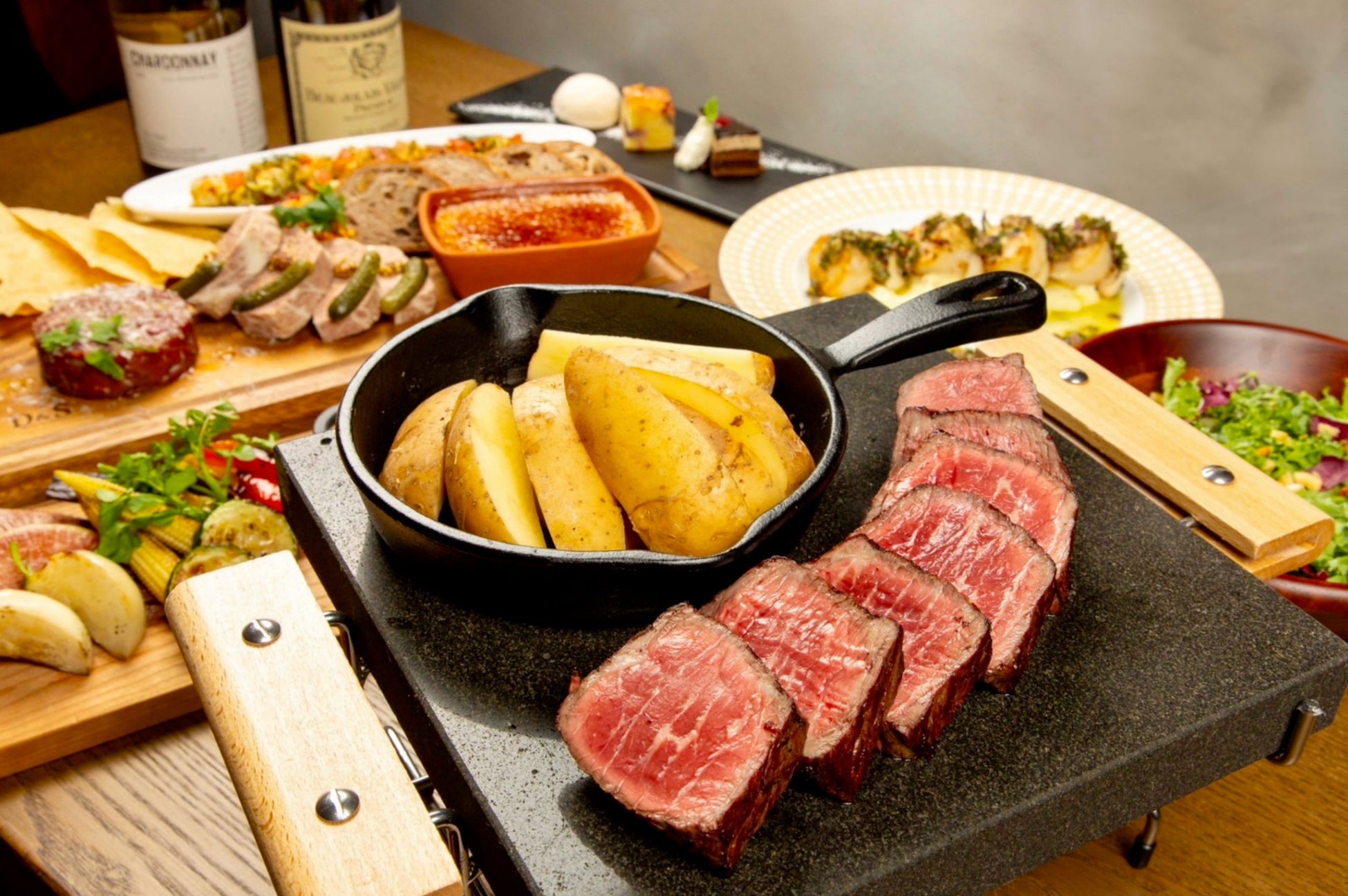 アリーナ南側に面する海やパークエリアを広く望むオーシャンビューレストランでは、豪快に焼き上げた塊肉ステーキを「ホットストーン」に乗せてご提供します。フランスで子供から大人まで愛されるソウルフード「ステックフリット」をお楽しみください。