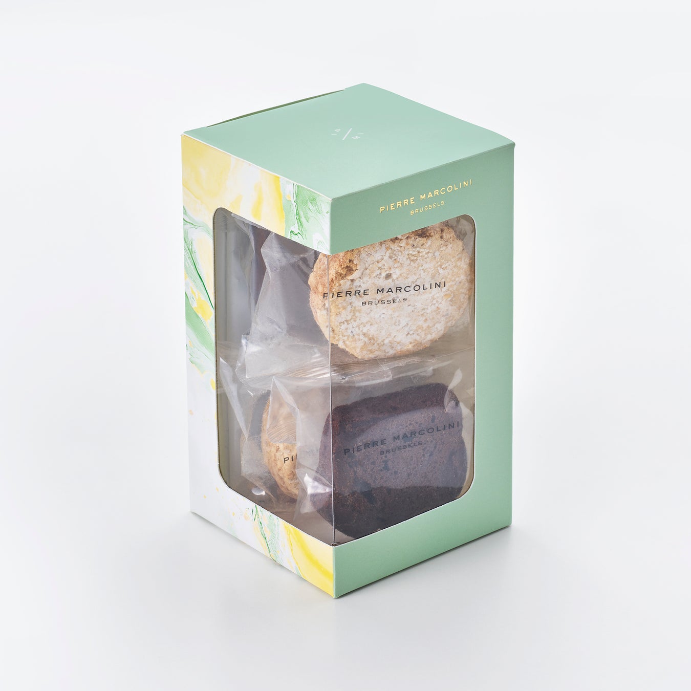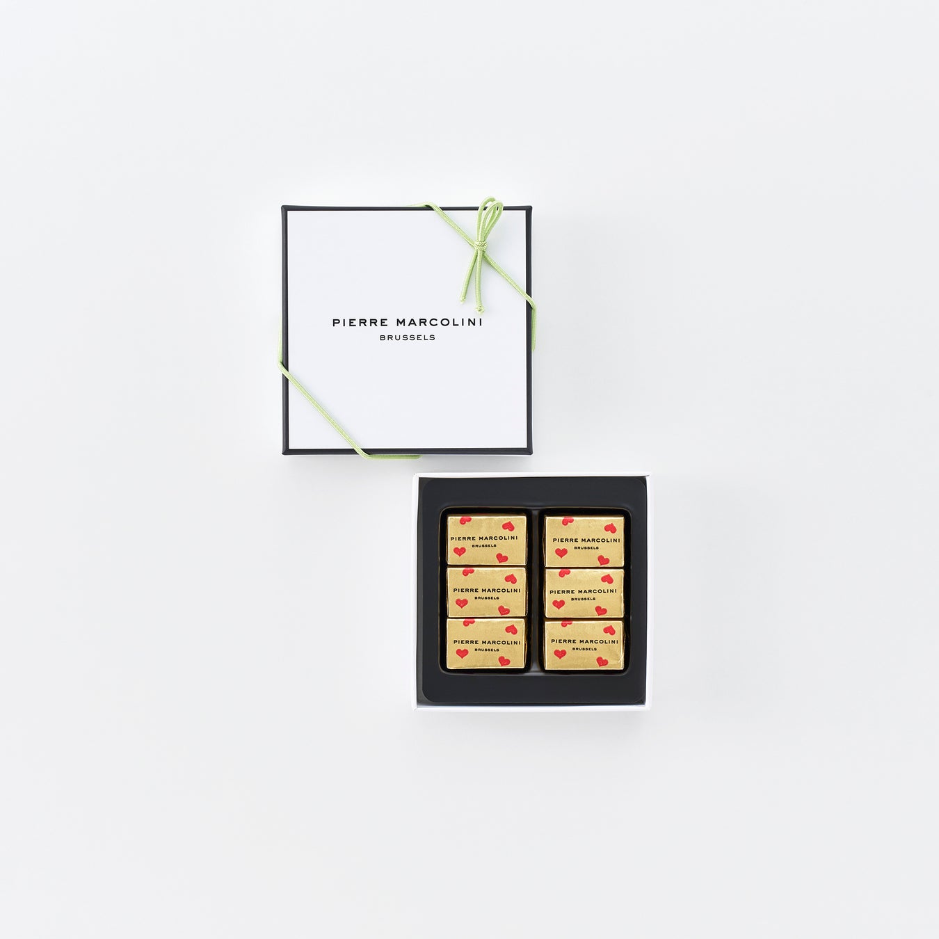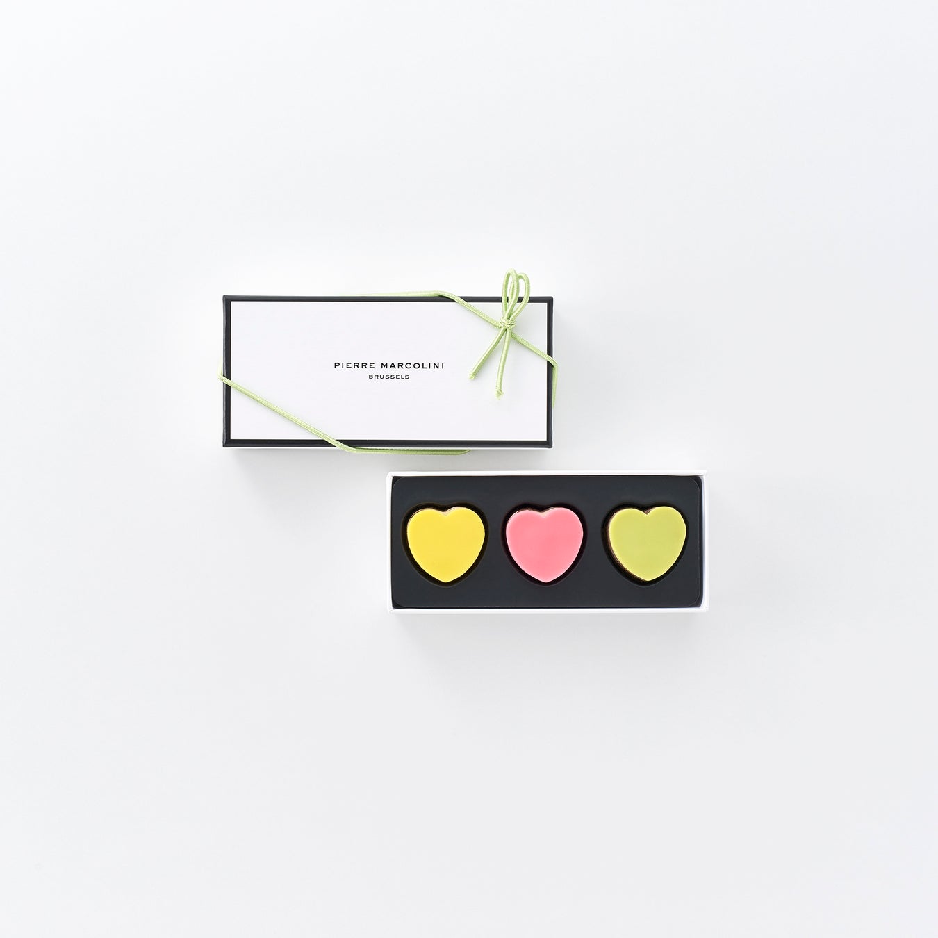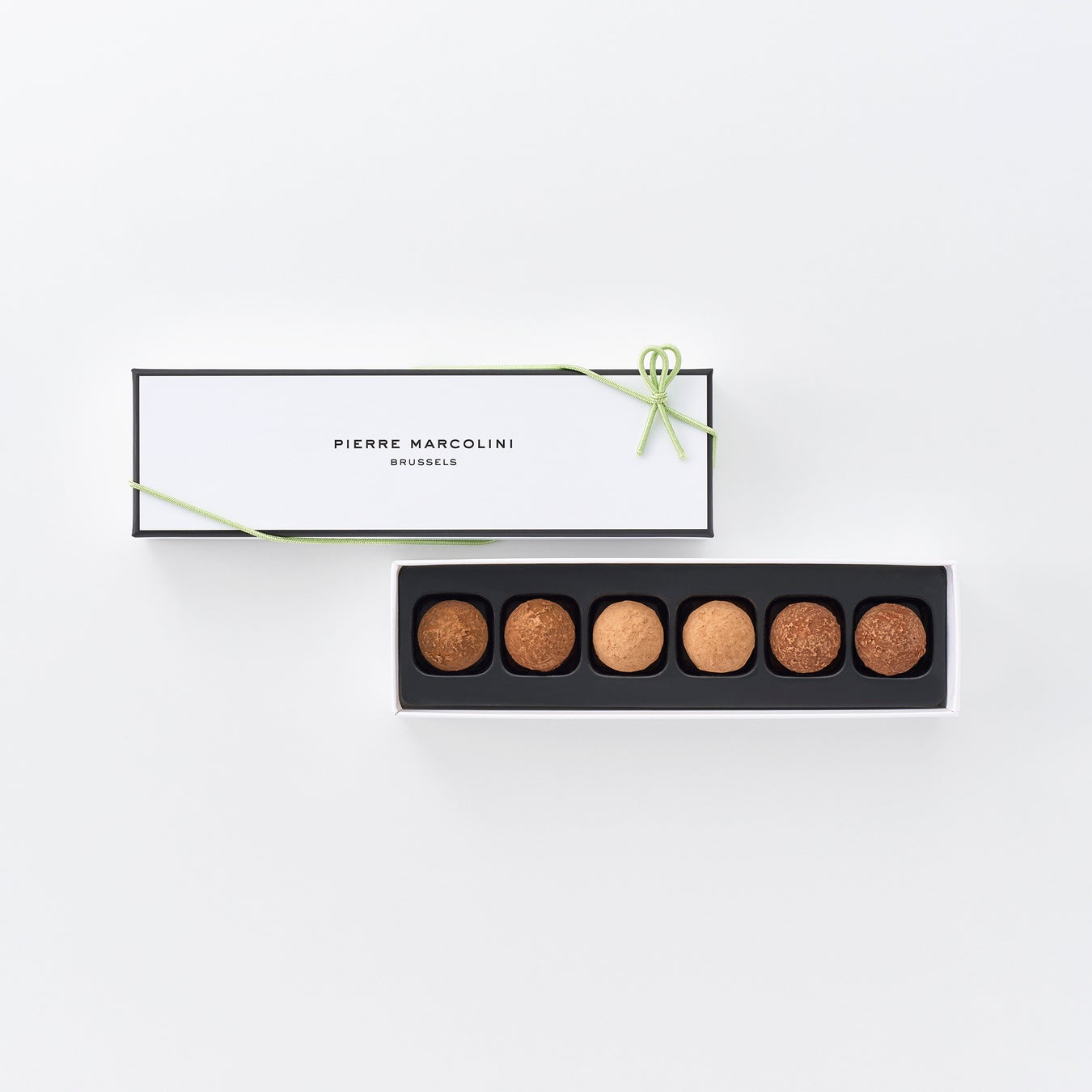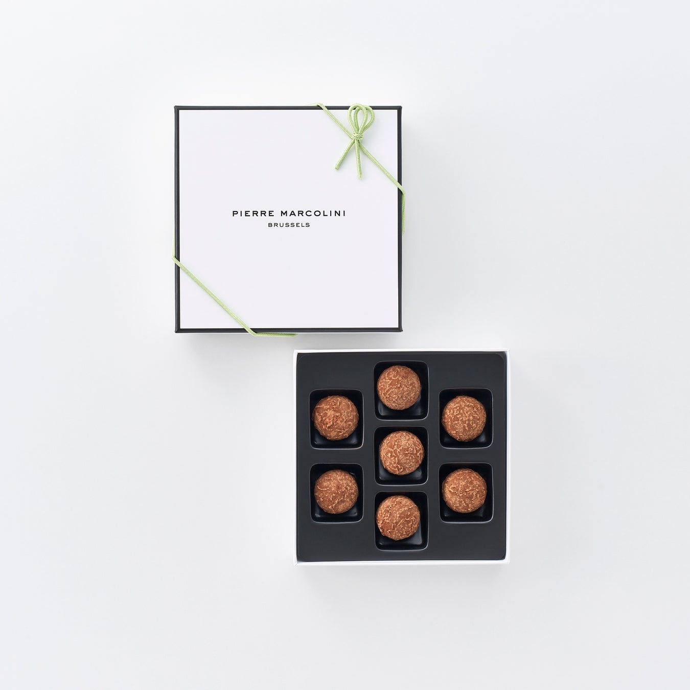 ピエール マルコリーニのオリジナルクーベルチュールで作ったシェルの中に、風味豊かでクリーミーなガナッシュやプラリネを詰め、ココアパウダーでコーティング。3種類のフレーバーをお楽しみください。