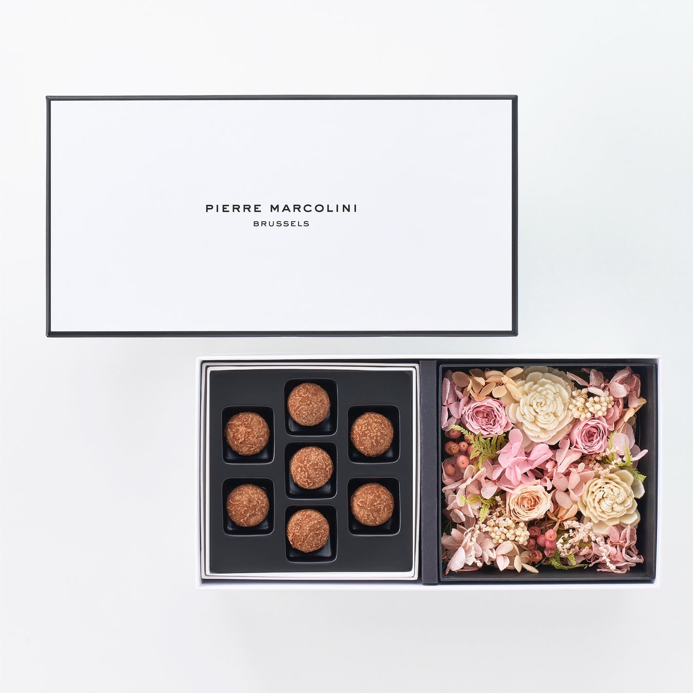 華やかなプリザーブドフラワーと「トリュフ デュ ジュール」を組み合わせたアソートメント。