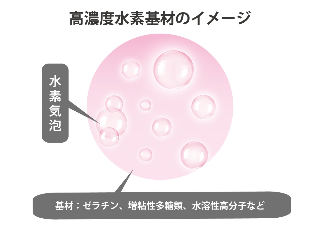 これらの課題に対し、当社は「水素分子を基材に溶かす」のではなく、「水素分子の微細な泡を、ゼラチンなどの高分子内に分散して保持させる」製品を開発し、安定的に製造する技術を確立することに成功いたしました。