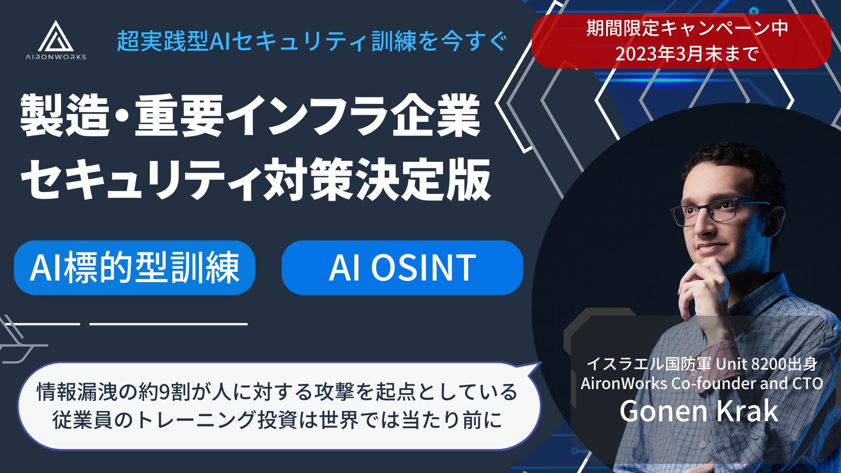 この課題に対応するために、AironWorksでは、「AI 標的型訓練」と「AI OSINT」をセットにしたパッケージの提供を開始します。これらの製品は、イスラエル国防軍の8200部隊(※2)にて重要任務と後進の育成に取り組んできた当社CTO Gonen Krakと同部隊出身者が実務レベルの防衛活動にて駆使してきた技術をベースに開発された製品群です。世界最先端のサイバーセキュリティ対策を日本国内の製造業・重要インフラ事業者