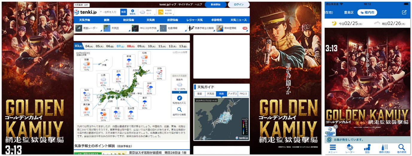 株式会社ALiNKインターネット(本社:東京都豊島区/代表取締役 CEO 池田洋人/以下、当社)は、一般財団法人 日本気象協会(本社:東京都豊島区、理事長:渡邊 一洋)と共同で運営している、天気予報専門メディア「tenki.jp」内で、3月13日(金)公開の映画『ゴールデンカムイ 網走監獄襲撃編』とのコラボレーションを3月6日(金)に開始します。