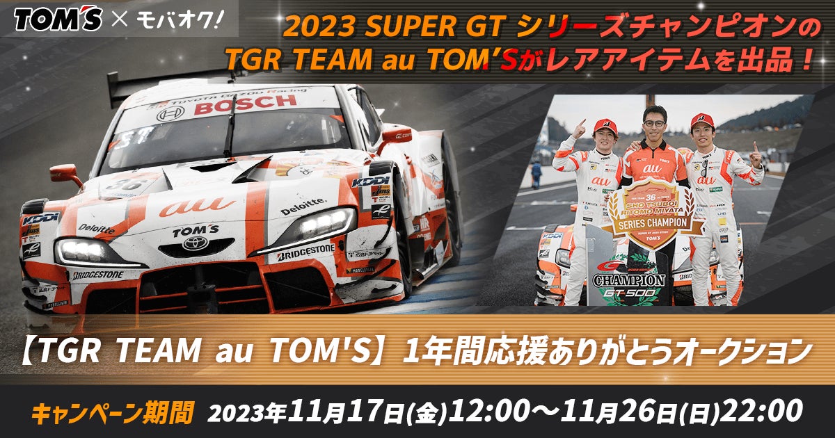 株式会社モバオク(本社:東京都渋谷区、代表取締役社長:生田目 知之、以下モバオク)が運営するオークションサービス「モバオク」にて、株式会社トムス(本社:東京都世田谷区、代表取締役社長:谷本 勲、以下トムス)が実施する「【TGR TEAM au TOM'S】1年間応援ありがとうオークション」を2023年11月17日(金)から2023年11月26日(日)まで開催します。