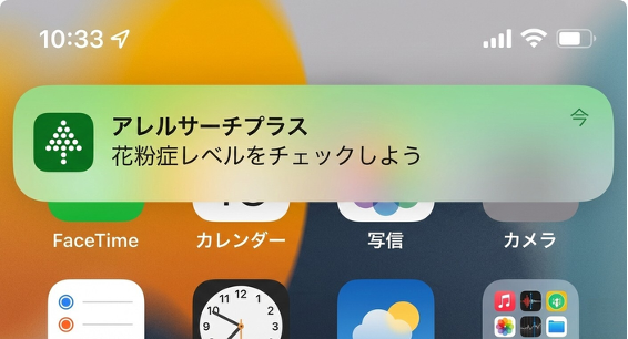 1)通知機能 花粉症対策は、「症状が出てから」ではなく「継続的な予防・ケア」が重要です。本アップデートでは、ユーザーが日々の対策を継続できるよう、花粉症レベルチェックを促す通知機能を追加しました。これにより、忙しい日常の中でも無理なく花粉症ケアを続けられるようサポートします。
