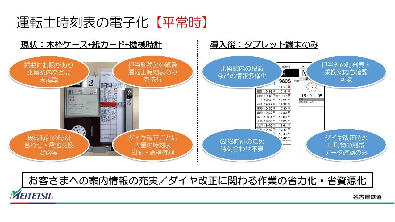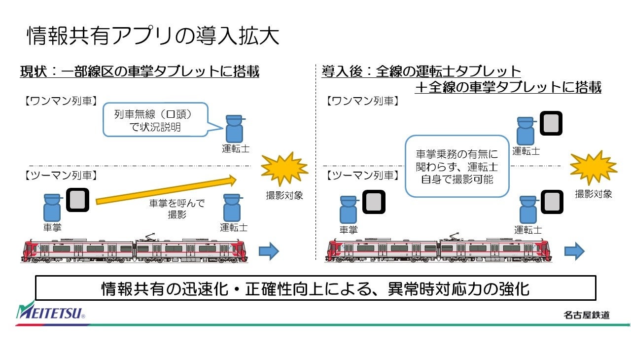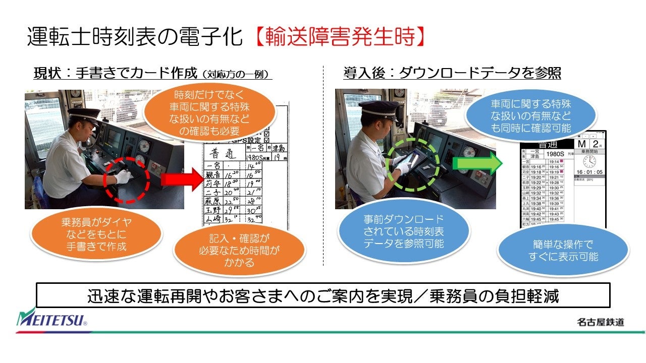 名古屋鉄道株式会社(本社:名古屋市中村区名駅 代表取締役社長 髙﨑裕樹)は、株式会社メイテツコム(本社:名古屋市中村区名駅南 代表取締役社長 山田和利)と共同開発した運転士業務用アプリを搭載したタブレット端末を8月17日より順次導入し、2023年度中に全線(築港線を除く)において使用を開始します。これにより、運転士の業務を支援することで、輸送障害時の対応力の向上およびご案内におけるサービス向上を図ります。