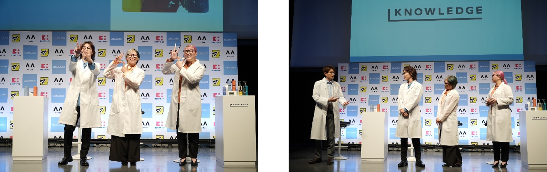 その後、俳優の白洲迅さんとお笑い芸人トリオのぱーてぃーちゃんが、人生初の“知的な”白衣姿でご登壇。スキンケアに関するトークセッションでは、白洲さんが、「30代に入り、よりスキンケアに気を遣うようになりました、撮影で日に焼けたなとか、乾燥したなと感じた日はパックしてみたり、あとはスキンケアかわからないですけど、お風呂で毎日冷水を浴びますね、肌と心を引き締めるために」と意外な日課を明かすと、信子さんから「それ、滑った後の芸人がやることですよ!」と鋭いツッコミを入れられていました。