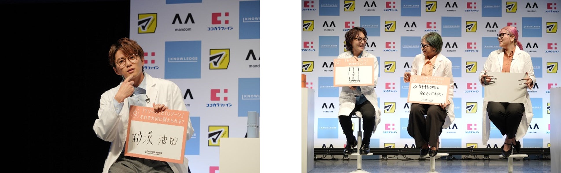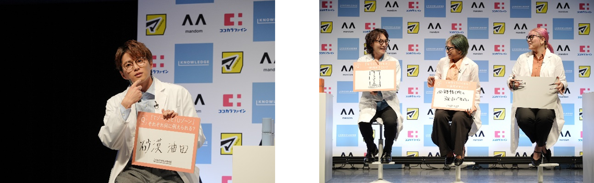 男性肌研究に基づいた新ブランドにちなみ、クイズ形式で白洲さん、ぱーてぃーちゃんが男性肌について学習。1問目の「男性肌の「Uゾーン」と「Tゾーン」はその特徴から、それぞれ〇〇と〇〇に例えられます。それらは一体なんでしょうか?」といった質問では、信子さんが「(T)テトリスだったら、(U)嬉しい形ですね~」、きょんちぃさんは、「(T)とてつもなく、(U)うるわしい日々」と大喜利で回答。すがちゃん最高No.1さんがそれぞれに「一気に(ブロックを)消せる可能性が出てきますね」「麗しい、ゴージャスなのね!」とフォローし、笑いを誘っていました。