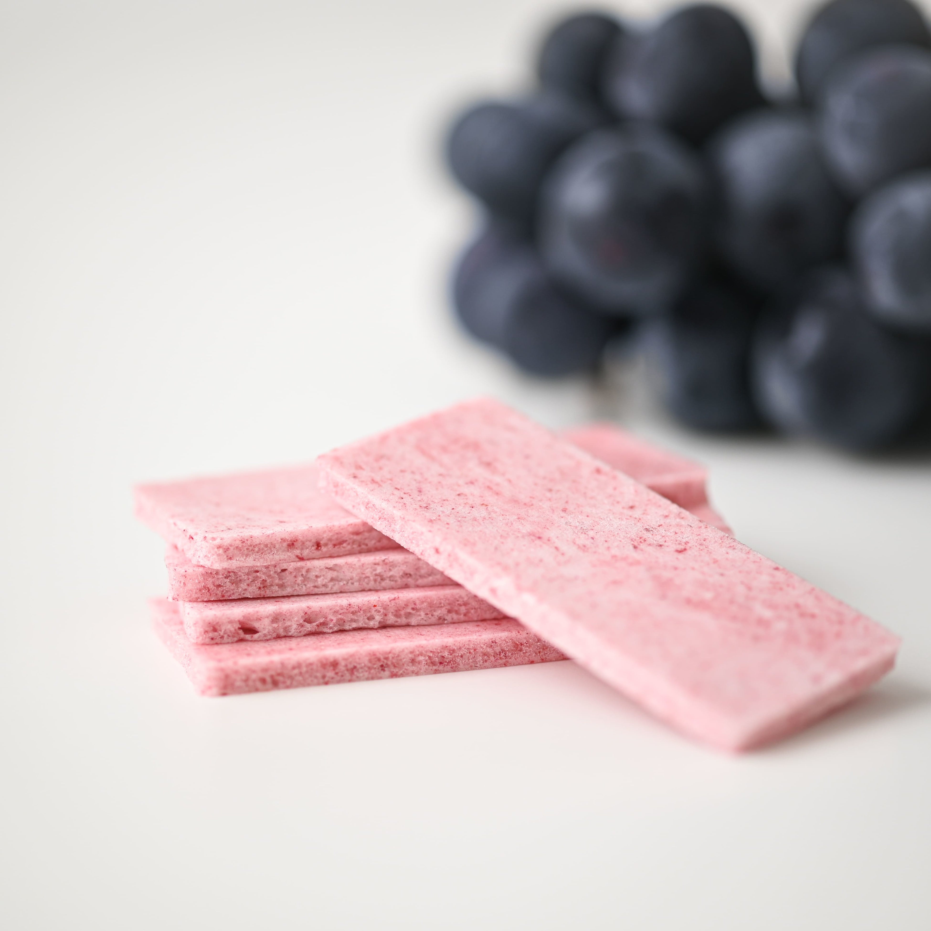 国産のキャンベルアーリーを、果皮・果肉共にピューレ加工の後、フリーズドライにしてあめに加え、無香料・無着色で仕上げました。