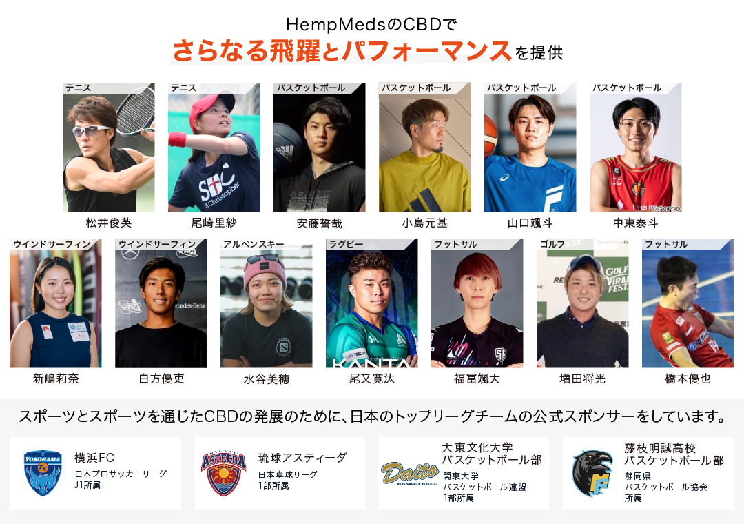 HempMeds(ヘンプメッズ)は、スポーツとスポーツを通じたCBDの発展のために、日本のトップリーグのチーム、アスリートをサポートさせて頂いております。