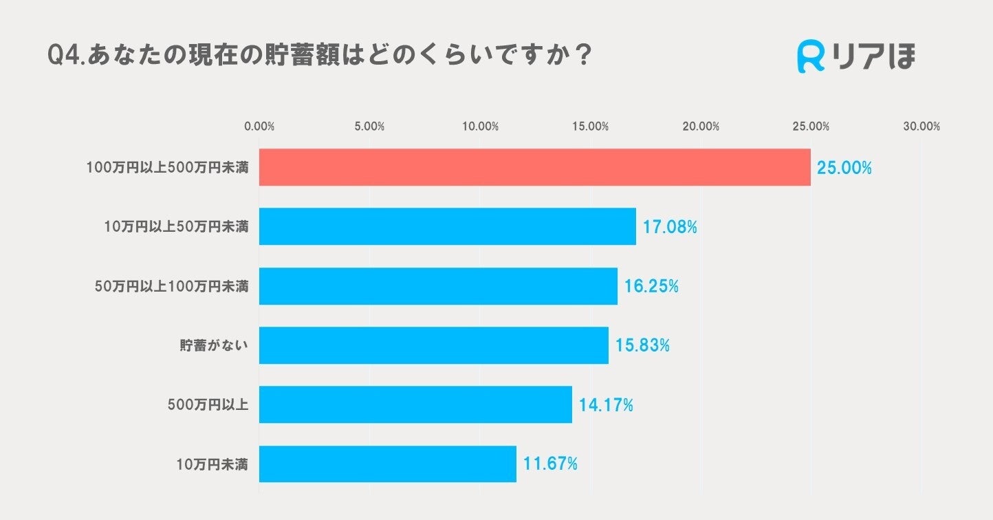 多くの回答者が100万円以上500万円未満の貯蓄を持っていることがわかりました。25.00%がこの範囲の貯蓄額を持っており、17.08%は全く貯蓄がないと回答しています。