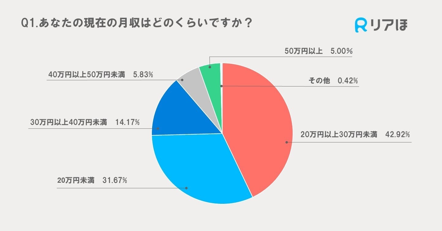 最も多い回答は「20万円以上30万円未満」で、全体の42.92%を占めました。次いで、「20万円未満」が31.67%、「30万円以上40万円未満」が14.17%、「40万円以上50万円未満」が5.83%、そして「50万円以上」が5.00%という結果となりました。