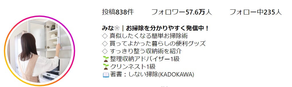 Instagramのフォロワー数57万人超、時間や手間をかけないお掃除術が「マネしたくなる!」と大人気。著書:しない掃除(KADOKAWA)も絶賛発売中。