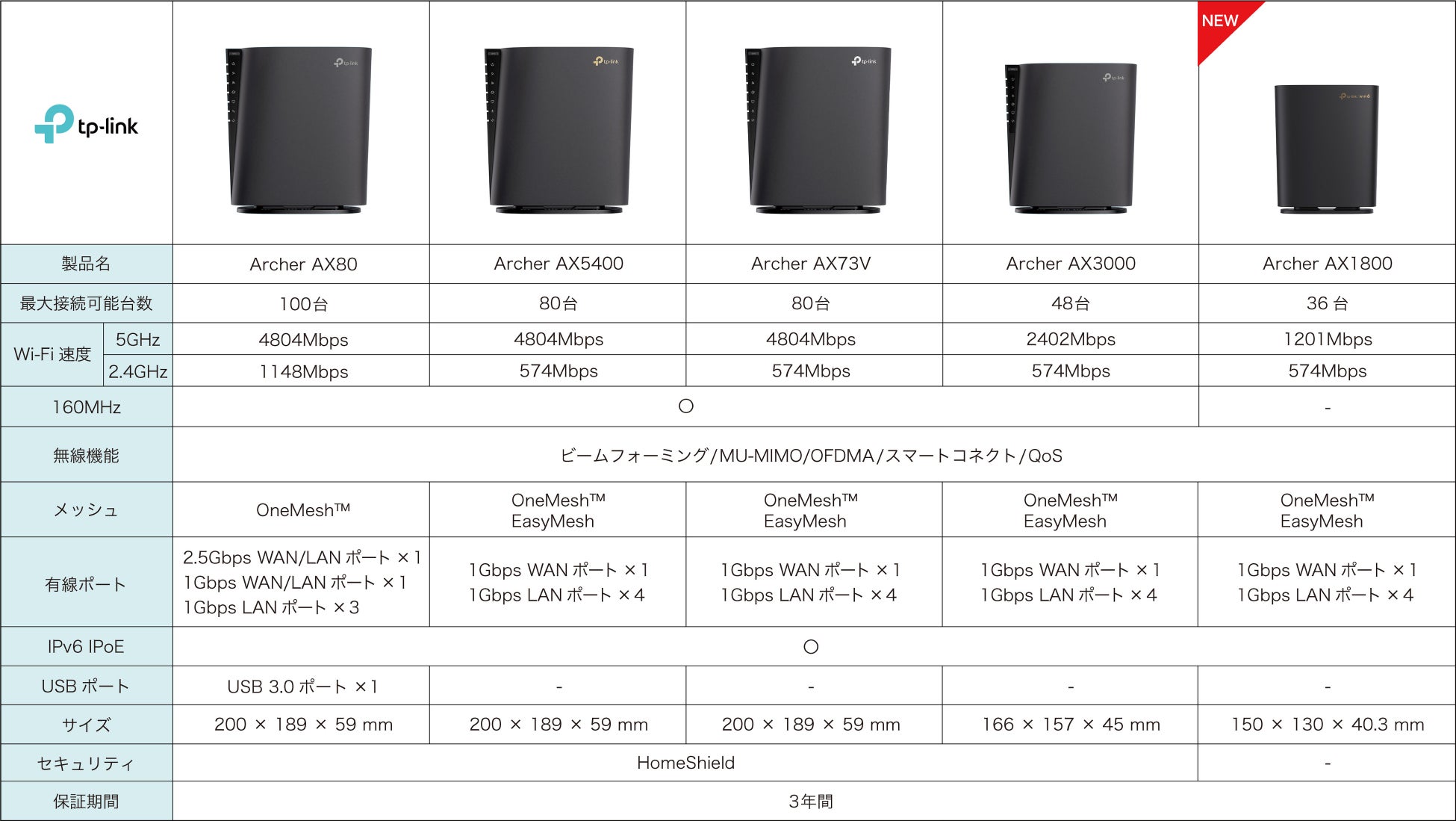 「Archer AX1800」製品ページ: https://www.tp-link.com/jp/home-networking/wifi-router/archer-ax1800/v2/