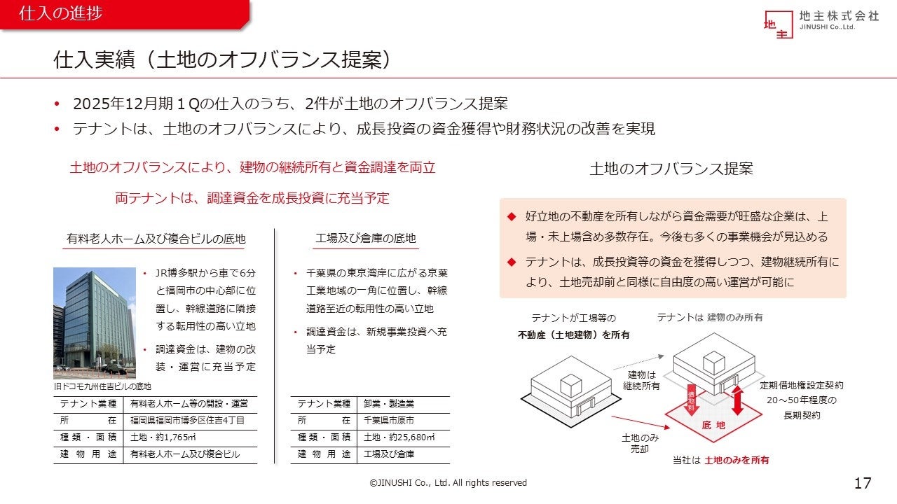 土地のオフバランスにより、テナントは建物継続所有と資金調達を両立することができ、両テナントとも調達した資金は成長投資に充当する予定です。