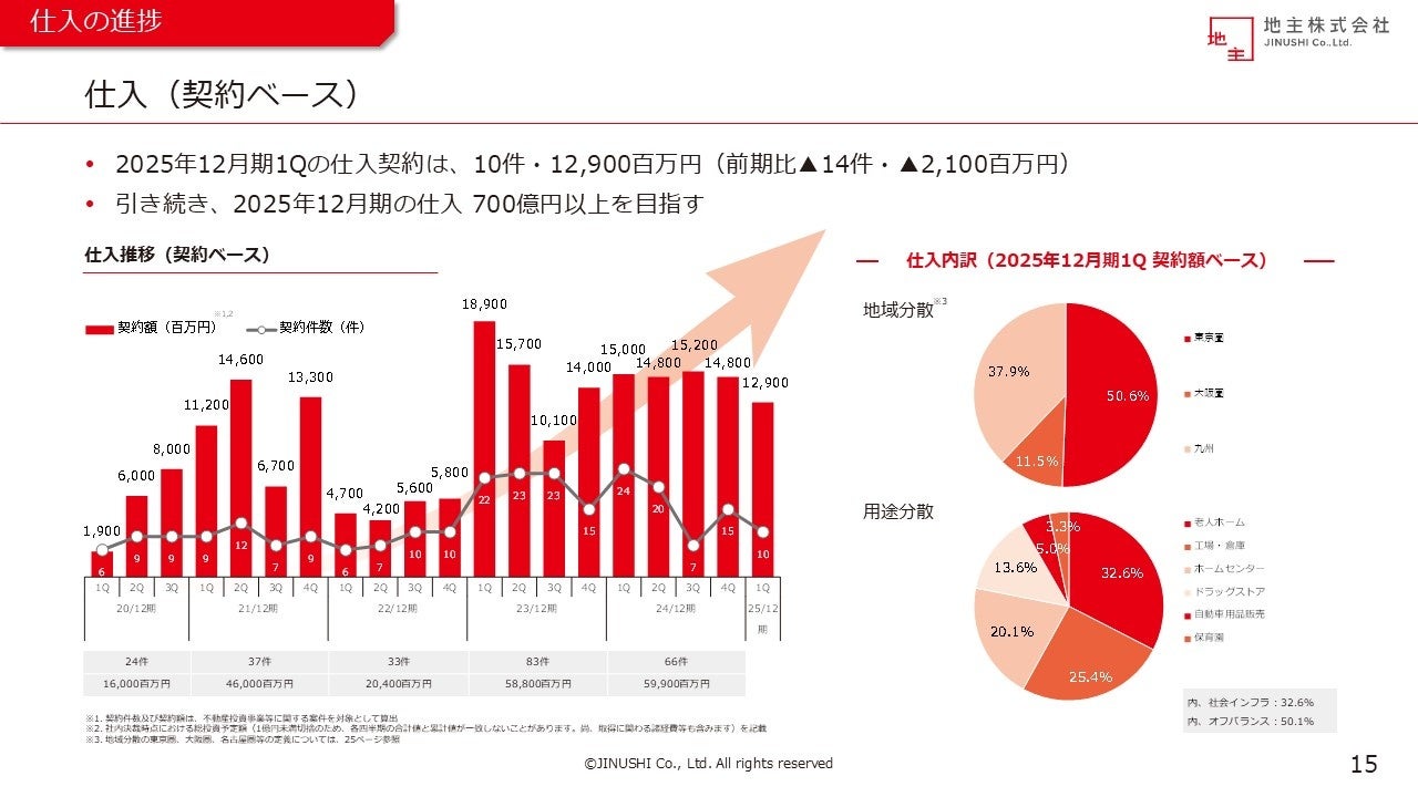 2025年12月期第1四半期の仕入(契約ベース)は10件・12,900百万円(前期比▲14件・▲2,100百万円)となりました。
