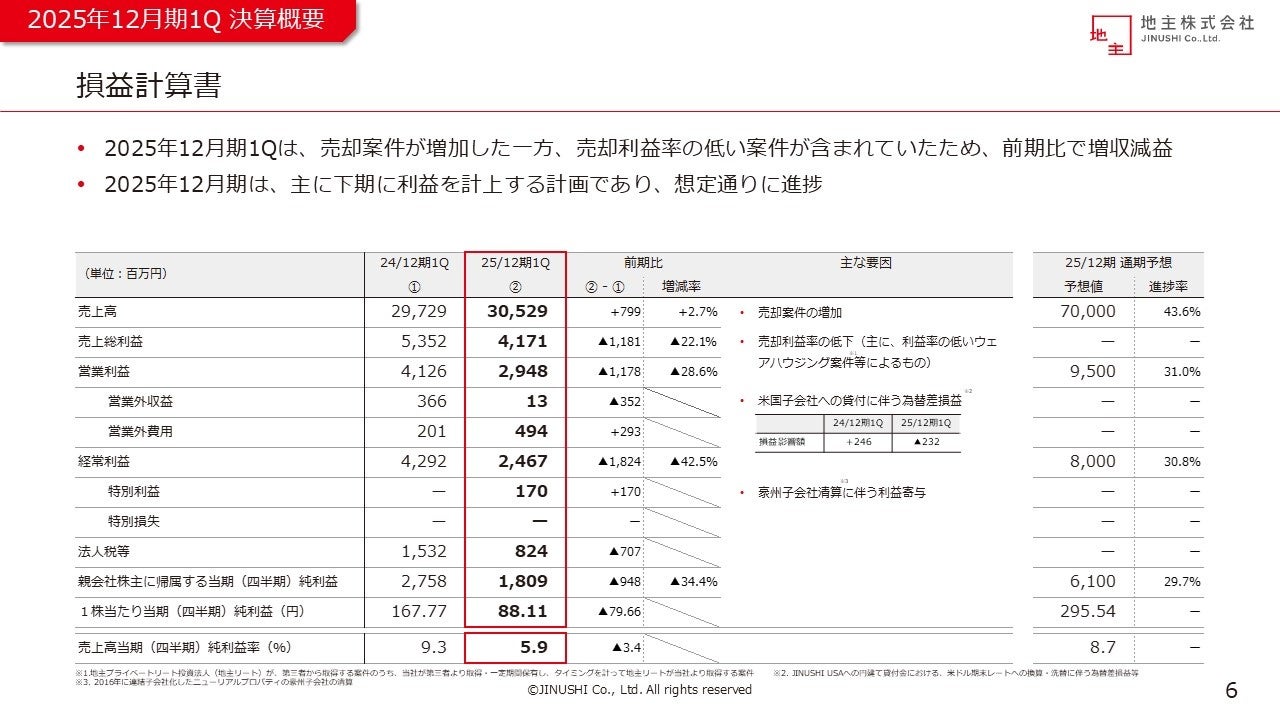 2025年12月期第1四半期は、売上高30,529百万円(前期比+799百万円)、営業利益2,948百万円(同▲1,178百万円)、当期純利益1,809百万円(同▲948百万円)と、売却案件が増加した一方、売却利益率の低い案件が含まれていたことにより、前期比で増収減益となりました。