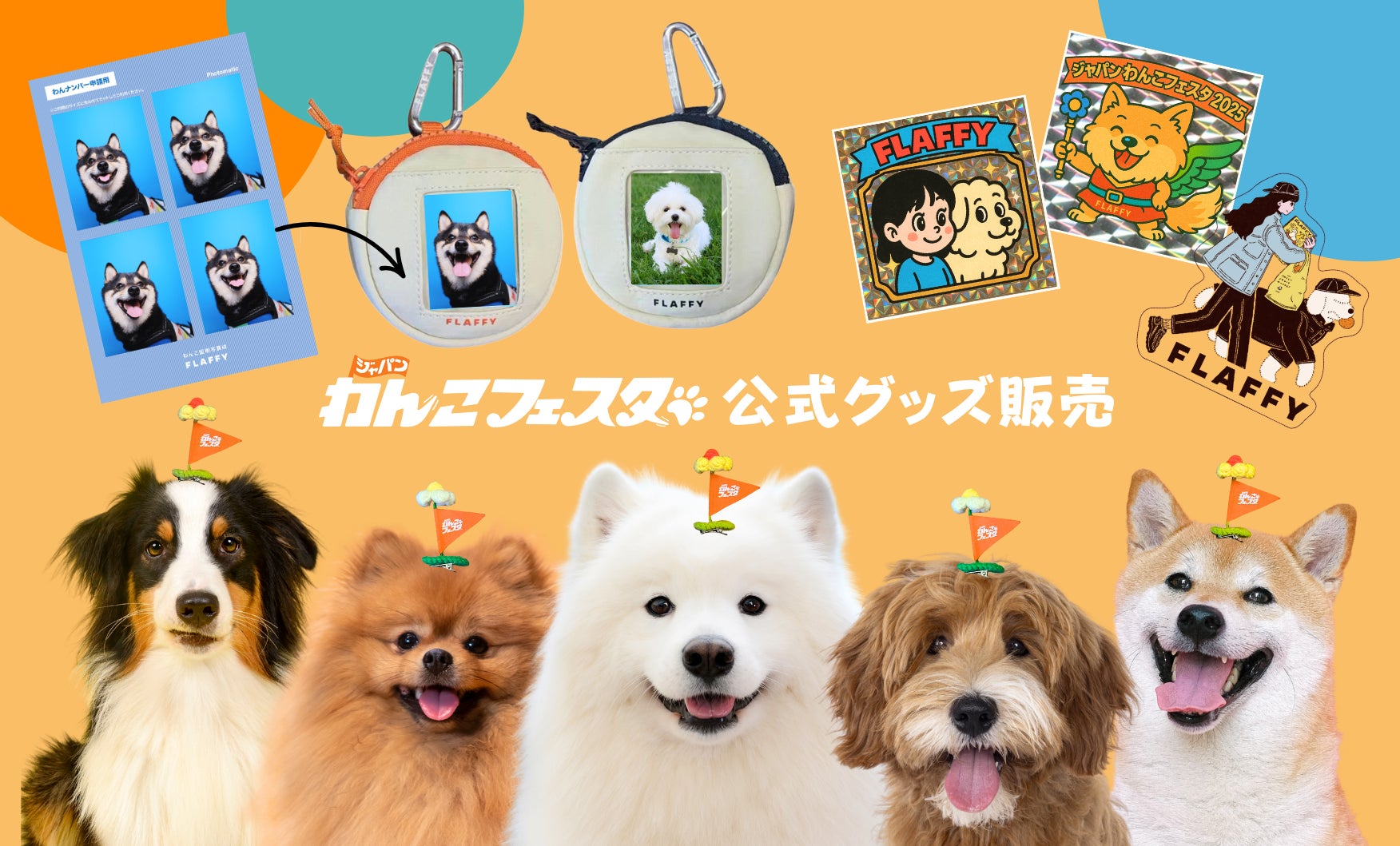 FLAFFYイベント初となるオリジナルグッズ販売が決定!ラインナップは全3種。「うちの子おやつポーチ」(オレンジ・ブラック/各 2,750円(税込)※イベント特別価格)や、「わんこぴん」(黄色・白/各400円(税込))、さらに「オリジナルステッカー」(3種/各200円(税込))。ここでしか手に入らない限定アイテムをぜひお見逃しなく!