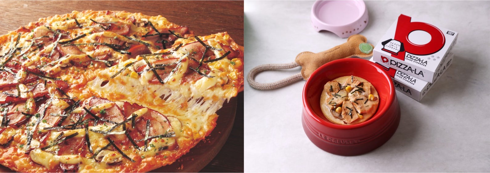 愛犬も一緒に楽しく食べられる商品を作っている「コミフデリ」とのコラボ商品を提供!人気ピザのテリヤキチキンをコミフ風にアレンジしました。箱もわんちゃんサイズに再現!さらに、通常の店舗でも提供、配達している「テリヤキチキン」も登場します。親子ピザ風に並べて、愛犬と一緒に写真撮影をお楽しみください。