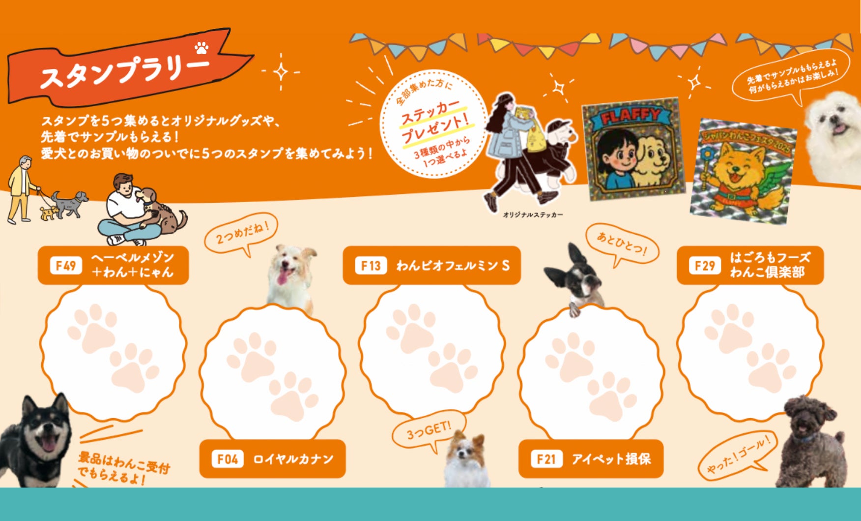 前回好評だったスタンプラリーを今回も開催します!会場内に設置された5つのブースを回ってスタンプを集めると、素敵な景品をプレゼント。すべてのスタンプを集めて受付に持っていくと、ここでしか手に入らない「FLAFFYオリジナルステッカー」をプレゼントいたします。ブースを巡ってイベントをより楽しみながら、来場の思い出をぜひ形にしてください。お子さまから大人まで楽しめる内容となっておりますので、ご家族やご友人、そして愛犬と一緒にふるってご参加ください!