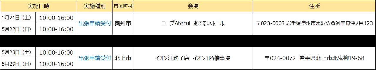 ※開催場所の調整状況や新型コロナウィルスの感染状況等により、「出張申請受付」及び「出張申請サポート」の開催を中止・延期、または実施内容が変更となる可能性がございます。