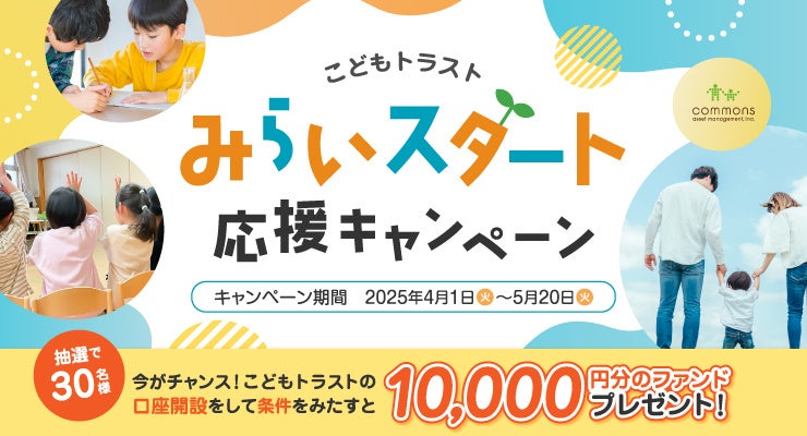 コモンズ投信株式会社(本社:東京都港区、代表取締役社長:伊井 哲朗、以下「コモンズ投信」)は、2025年4月1日(火)から2025年5月20日(火)、こどもトラストの口座を開設して所定の条件を満たした方を対象に抽選で30名様に1万円分のファンドをプレゼントする「みらいスタート応援キャンペーン」を実施いたします。