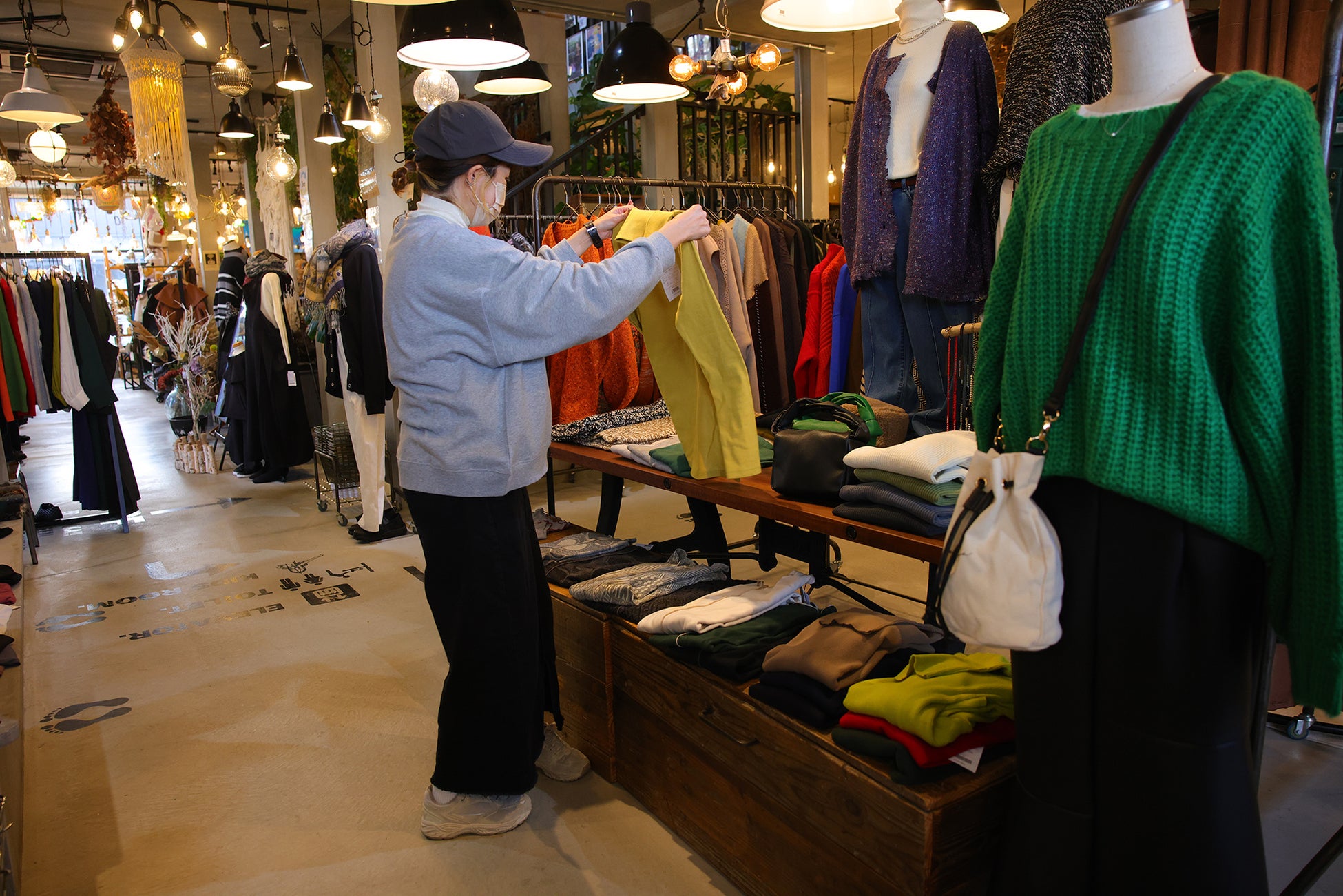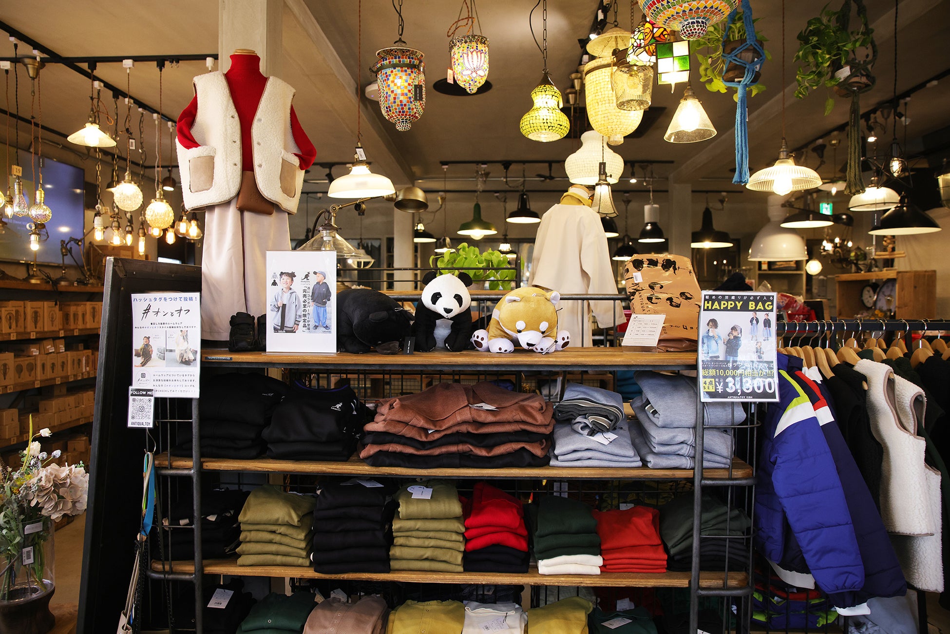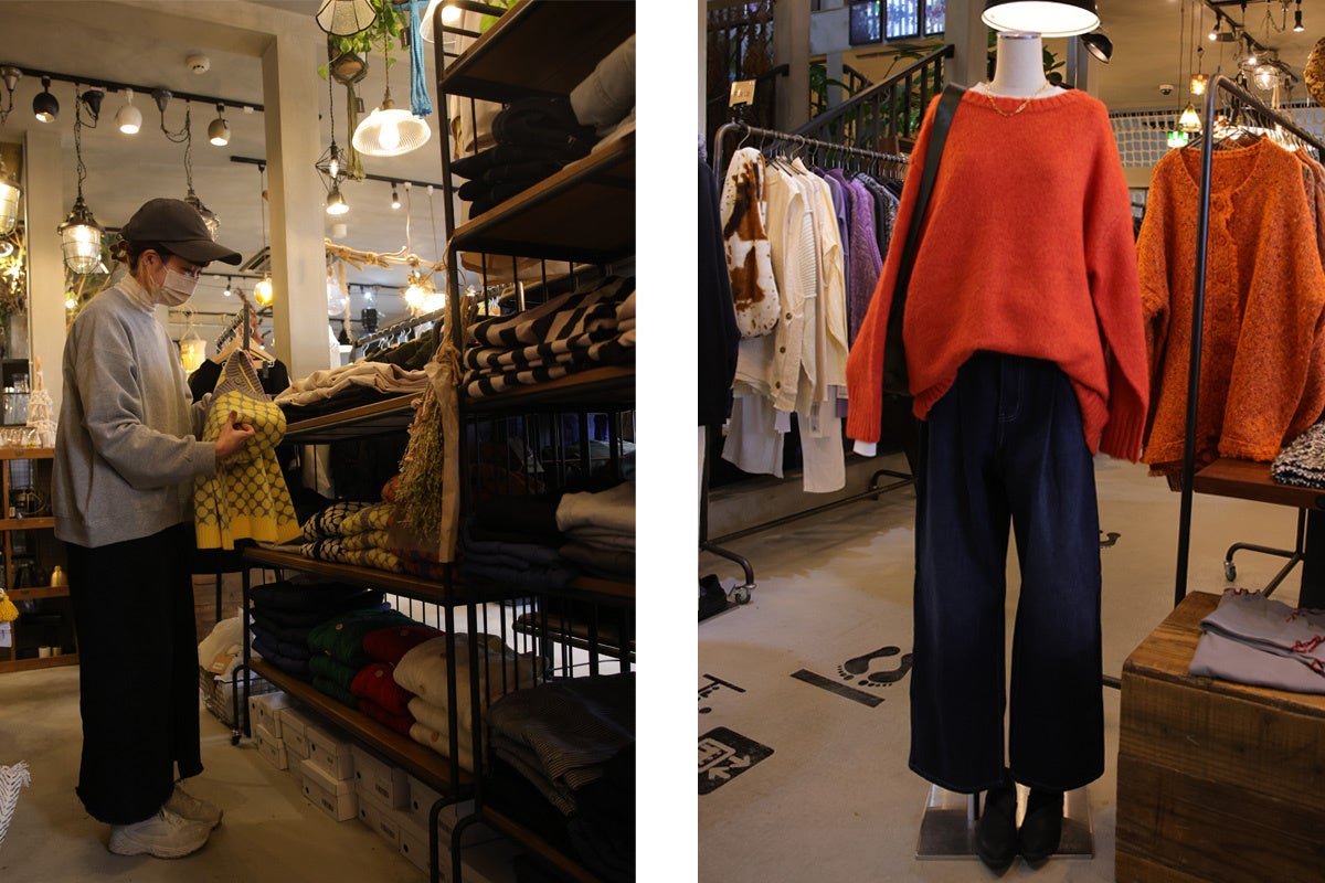 1階のセレクトショップは、最新のトレンドを反映したハイセンスな洋服や定番のロングセラー商品が並びます。従来よりも棚の高さを低くし、お客様に手に取っていただきやすいレイアウトに変更しました。さらに、すっきりと見やすい陳列にすることで、快適にお買い物を楽しんでいただけるようにしました。