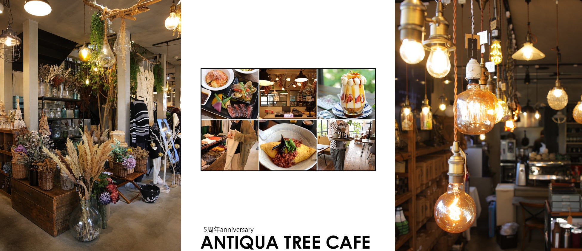 「ANTIQUA TREE CAFE」は2017年11月にオープンした、国内唯一となるANTIQUAの実店舗。ANTIQUAがセレクトした洋服や雑貨がずらりと並ぶセレクトショップ(1階)と、本格イタリアンシェフによるお料理やスイーツが楽しめるカフェレストラン(2階)の複合店舗となります。