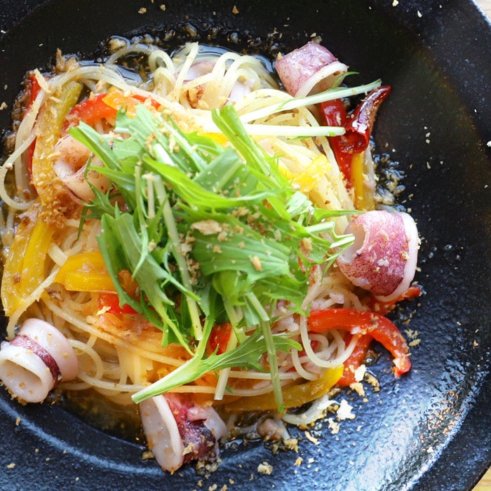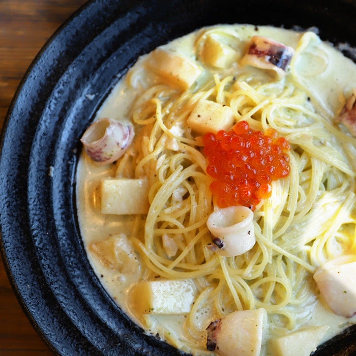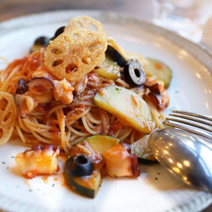2階に上がるとおしゃれなカフェレストランが。ホテルの料理長やイタリアへの料理留学経験のある一流イタリアンシェフによる、パスタやハンバーガー、季節のスイーツといった絶品のお料理が堪能できます。(写真上から)「自家製ジェノベーゼクリームパスタ」「彩り野菜とイカのペペロンチーノ」「北海タコのトマトソース柚子胡椒風味」の3つの新メニューも登場しました。なお、カフェで使用している家具もすべてご購入いただけます。