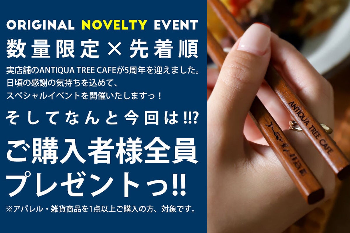 カフェレストラン・アパレル・雑貨の複合店舗「ANTIQUA TREE CAFE」(大阪府和泉市)を運営する株式会社ツリーカフェはこのたび、自身が運営する「ANTIQUA TREE CAFE」のオープン5周年を記念して、店舗でアパレル・雑貨商品を一点以上ご購入いただいた方にもれなくオリジナル箸を贈呈するプレゼントキャンペーンを開始いたしました。