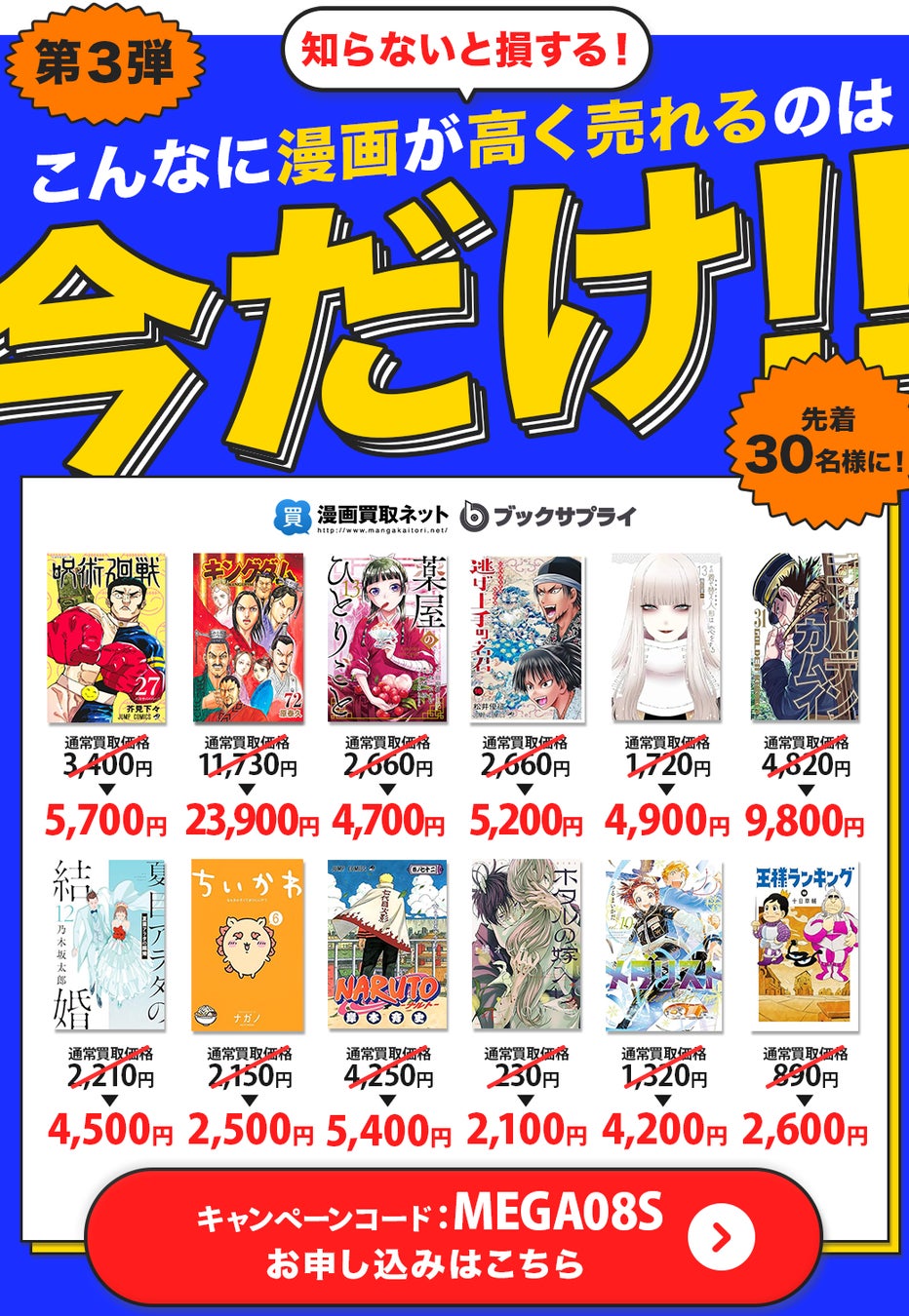 株式会社ブックサプライ(本社:大阪府吹田市、代表取締役:藪田真吾)が運営する漫画専門の買取サイト「漫画買取ネット」では、2024年9月1日(日)から2024年9月16日(日)まで、「超!高価買取 こんなに漫画が高く売れるのは今だけ!!」キャンペーン第3弾を開催いたします。