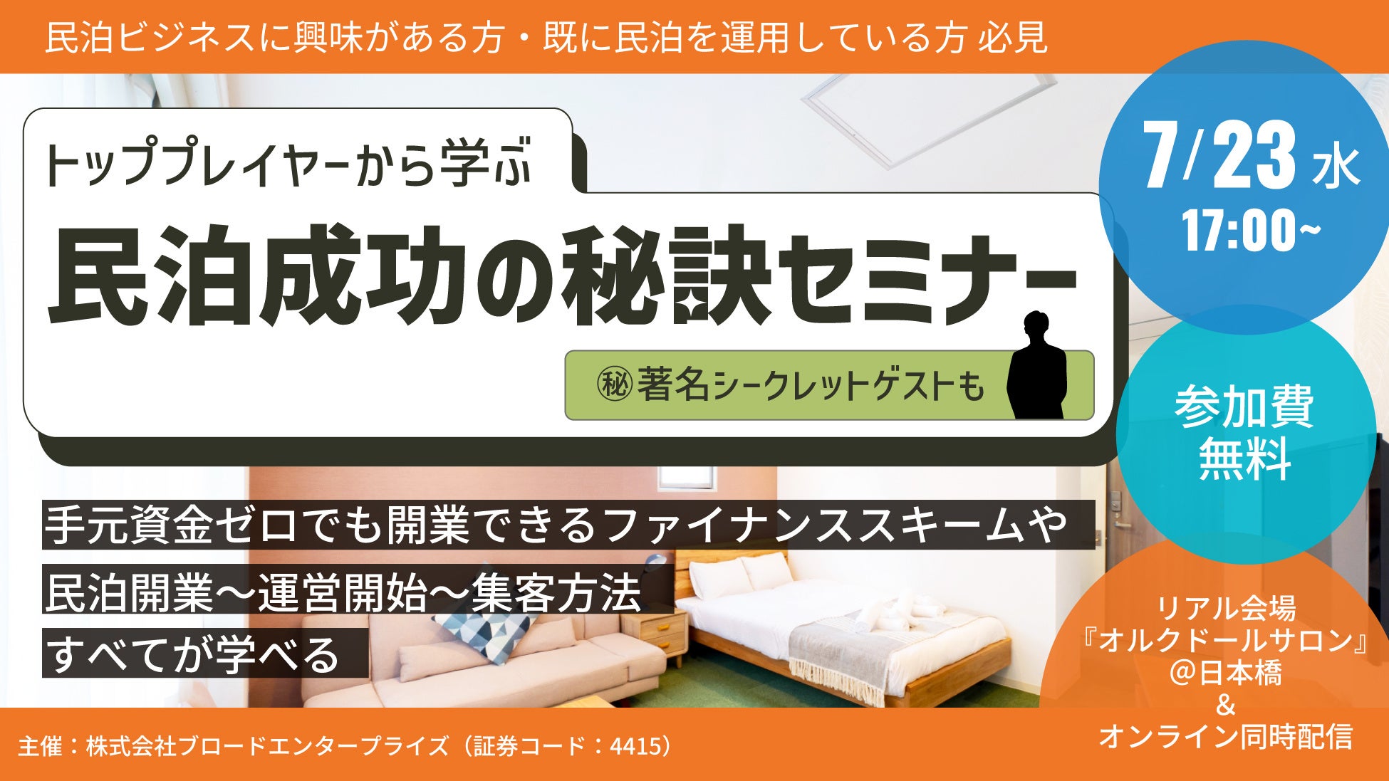 7/23(水)参加無料 | ブロードエンタープライズ主催で民泊ビジネスのトッププレイヤーとともに最前線を語るセミナーを開催@オルクドールサロンTOKYO