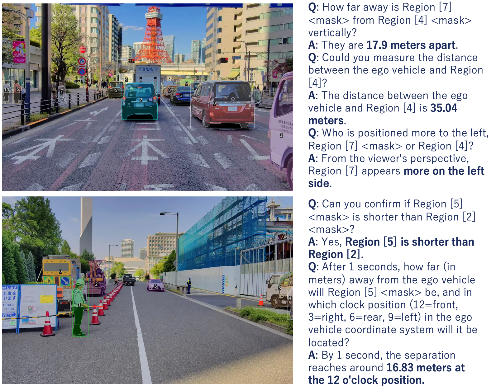 各シーンでは車両や歩行者などすべての交通オブジェクトに一貫した ID と三次元バウンディングボックスを付与し、空間だけでなく前後の時間関係まで連続的に追跡できる構成となっています。さらに「横断歩道に歩行者はいるか」「2秒後に前方車との距離は?」といった対象物視点と自車視点の質問‐回答を計1,263 万組生成しており、AI が状況を言語で説明し、将来を推測する性能まで評価可能です。