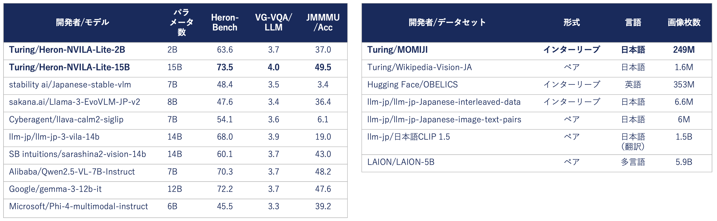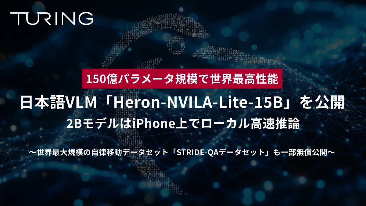 Turing 株式会社(本社:東京都品川区、代表取締役 山本一成、以下「チューリング」)は、新たな日本語VLM「Heron-NVILA-Lite-15B/2B/1B」 を公開しました。150億パラメータの15Bモデル は「Heron-Bench」で73.5を記録するなど、複数の日本語視覚-言語ベンチマークで同パラメータ規模のオープンモデルを上回る性能を達成。20億パラメータの2BモデルはiPhone上で完全ローカルかつ高速に推論可能です。