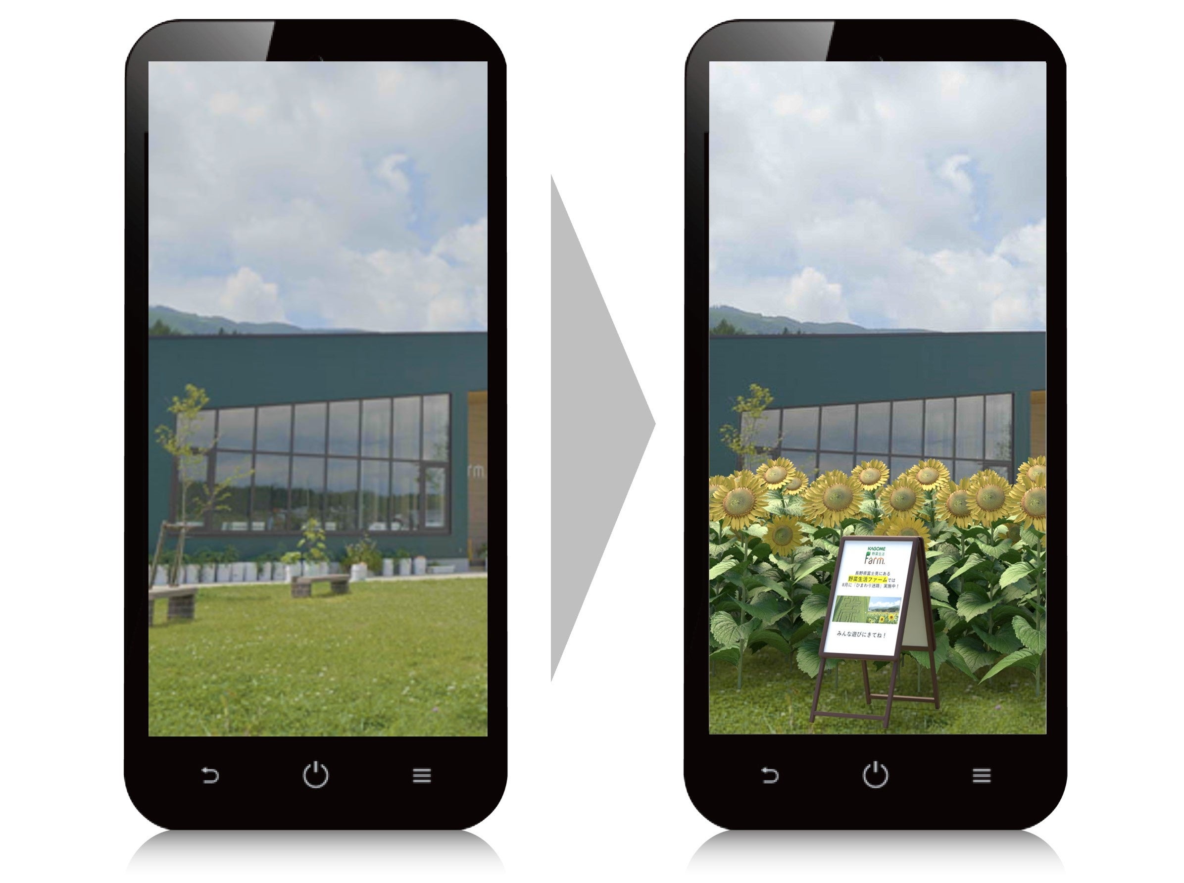 AR体験コンテンツでは、季節によって様々に変化する野菜生活ファームのコンテンツを、AR技術を活用し、臨場感のあるバーチャル体験としてご提供します。畑などに設置されたARマーカーをスマートフォンのカメラで読み込んでいただくと、夏に楽しめる「ひまわり畑」が一望できたり、春から夏にかけて楽しめる巨大な「トマトの樹」が出現したりします。また、ARマーカーは、施設内の様々な箇所に設置されており、ラリー形式でお楽しみいただけます。「探す・発見・知る」という楽しいAR体験を拡充し、野菜や野菜が育つ畑を、季節を問わず体験していただくことで、野菜生活ファームでの体験価値をさらに高めてまいります。