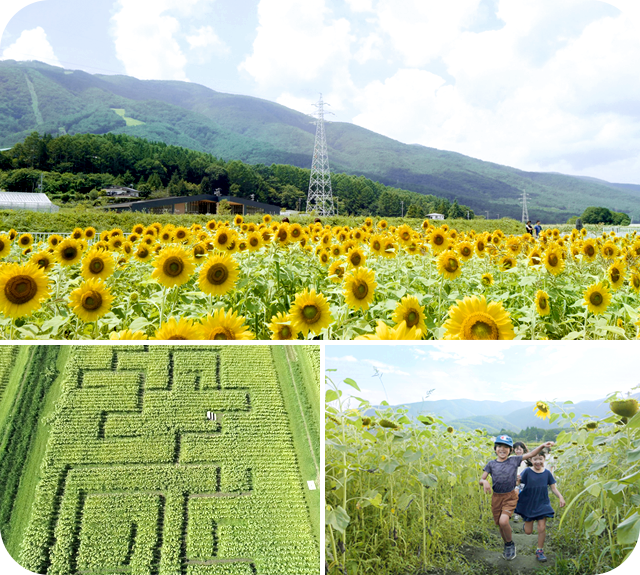 夏には、ひまわり畑の迷路(写真)をお楽しみいただけます。その他、当日ご来場されたお客様にお楽しみいただけるイベントも多数予定しています。(例)ひまわり畑の迷路 (8月中旬)