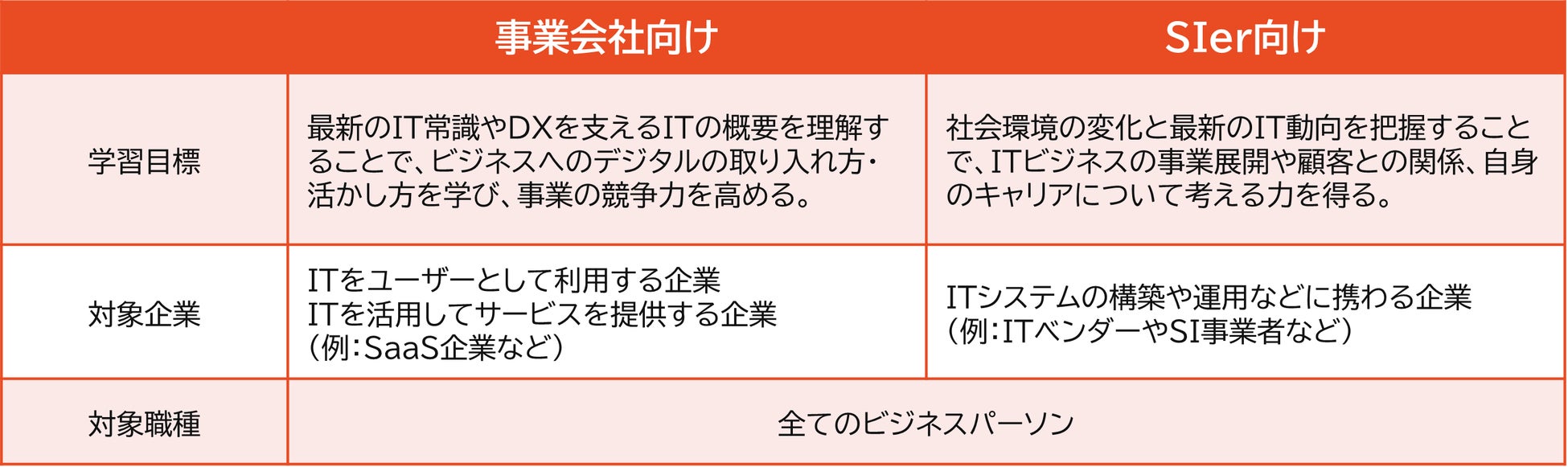 ITをユーザーとして活用する場合や、ITを活用してサービスを提供する場合に特に必要となる知識範囲を重視しました。ビジネスへのデジタルの取り入れ方・活かし方を学び、事業の競争力を高めることを目的としています。SIer向け: