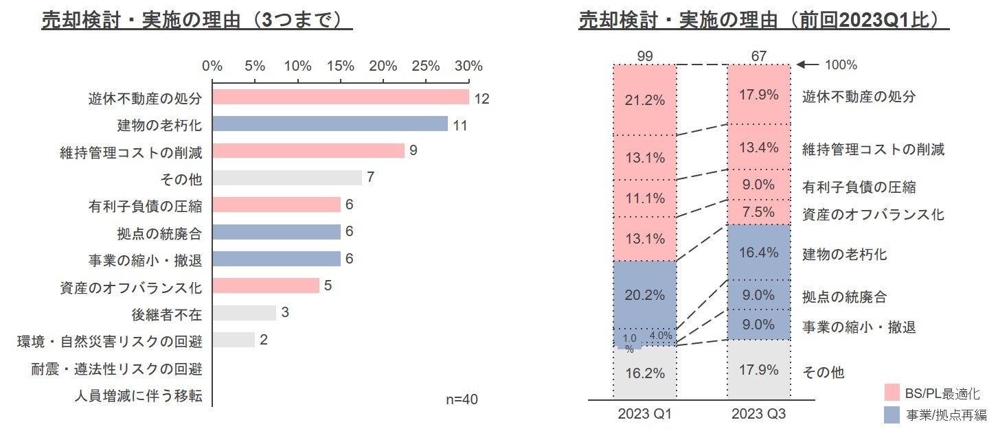 不動産売却理由は、「遊休不動産処分」が最も多く、次いで「建物の老朽化」が多い結果となった。「拠点統廃合」や「事業の縮小・撤退」の割合が増加し、事業/拠点再編に関する項目の割合が高まった。