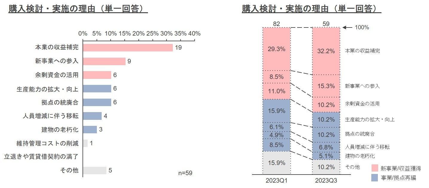 特徴的であった調査結果としては、不動産購入理由では「本業の収益補完」が最も多く、「新事業への参入」が続く結果で、前回より「新事業/収益獲得」の割合が更に高まる結果となりました。
