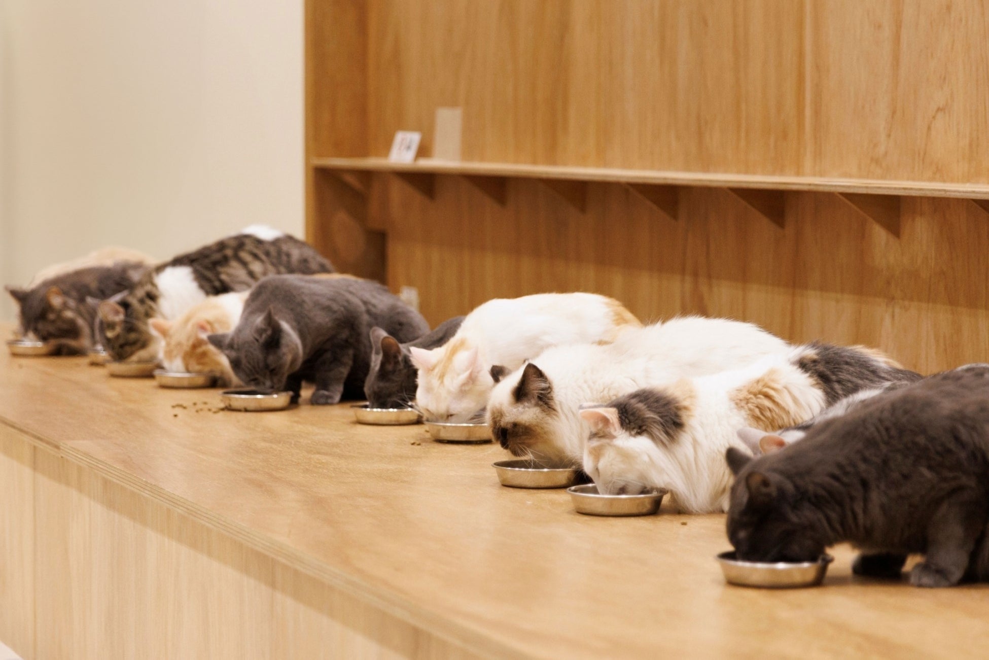 Cat Café MOFFでは、ネコの生態に合わせた室温のコントロール、ボディコンディションスコアを用いた食事量のコントロールや健康状態の確認、メンテナンス等を実施しています。