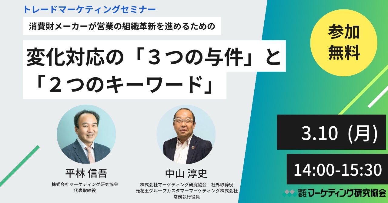 消費財メーカーが営業の組織革新を進めるための変化対応の「3つの与件」と「2つのキーワード」 無料オンラインセミナー開催 株式会社マーケティング研究協会