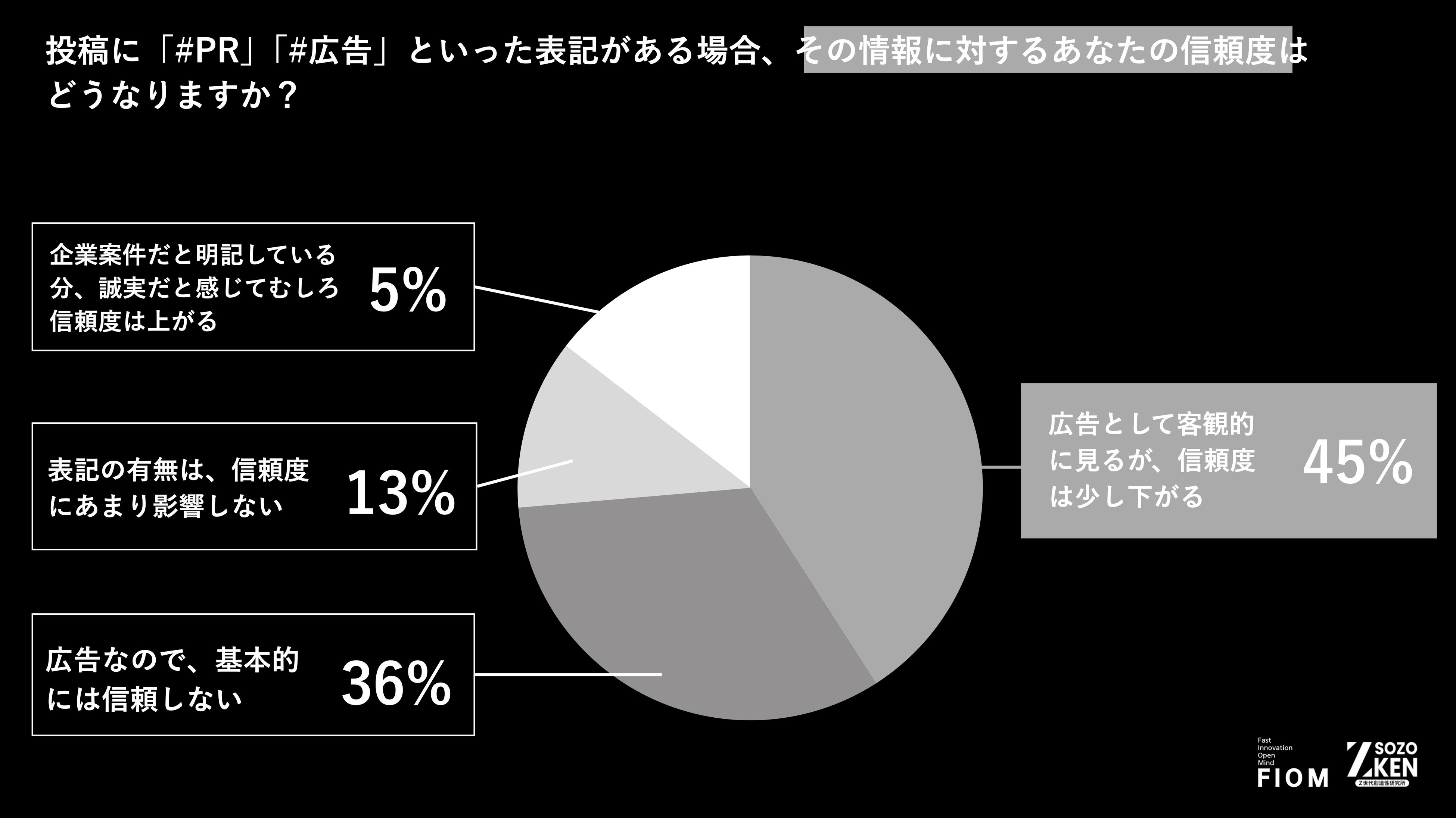 投稿に「#PR」「#広告」といった表記がある場合、「広告として客観的に見るが、信頼度は少し下がる」(45%)、「広告なので、基本的には信頼しない」(36%) と回答。合計81%が企業案件に対してシビアな目線を向けています。