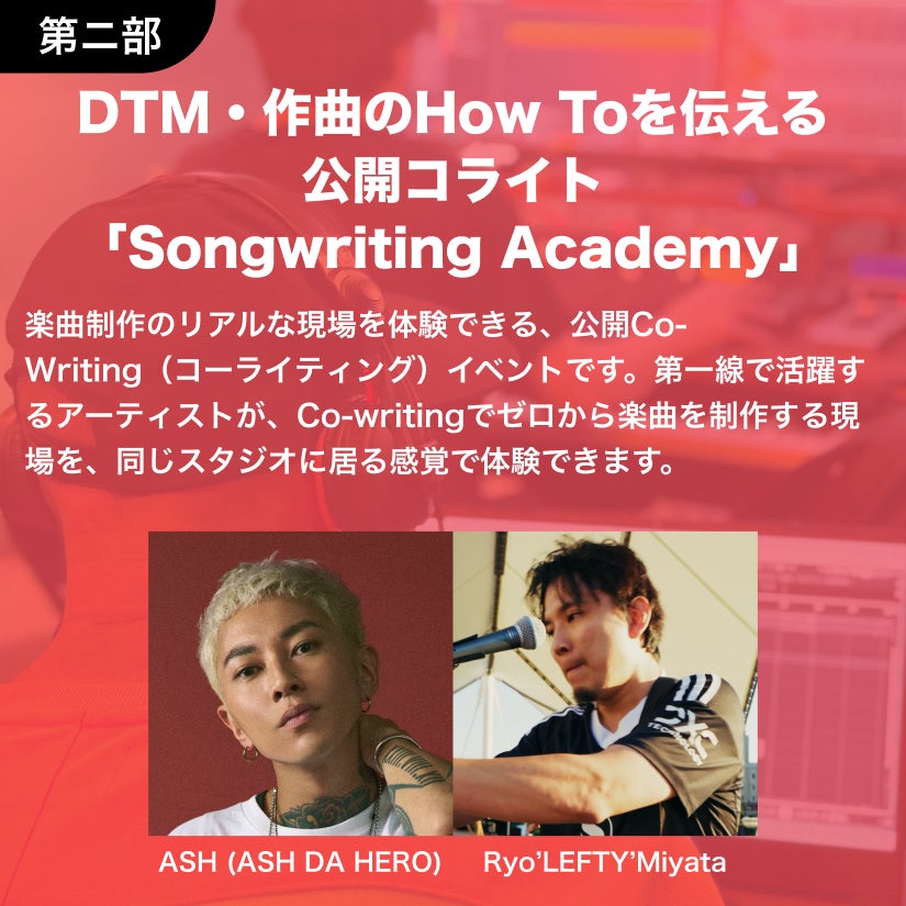 “第2部 公開Co-Writing「Songwriting Academy」”では、DTMの使い方やCo-Writingによって音楽が生まれる様を、実際にライブ形式で楽しみながら学べます。
