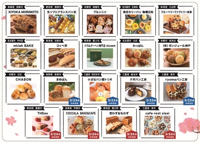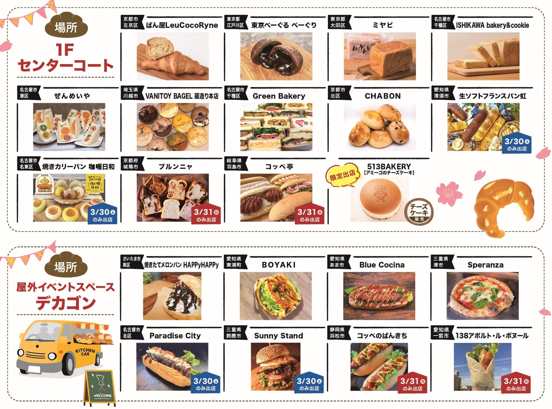 ららぽーと愛知東郷では16店舗、ジャズドリーム長島では19店舗、ららぽーと名古屋みなとアクルスでは20店舗が出店し、計55店舗※が参加する愛知県・三重県内の商業施設で最大規模のパン祭りです。