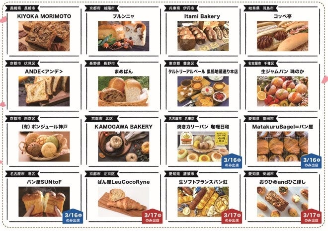今回、一般社団法人パン好き協会 会長 石臥博代さんがセレクトし日本全国から選りすぐりの個性豊かなパン屋が参加。長崎県長崎市からは「溢れる栗のクロワッサン食パン」で人気を集める「KIYOKA MORIMOTO」や岐阜県羽鳥市のコッペパンの専門店「コッペ亭」など、個性豊かな専門店が数多く参加します。また、埼玉県川越市のベーグルの専門店「VANITOY BAGEL」など愛知県・三重県で初出店となる店舗も多数集まります。
