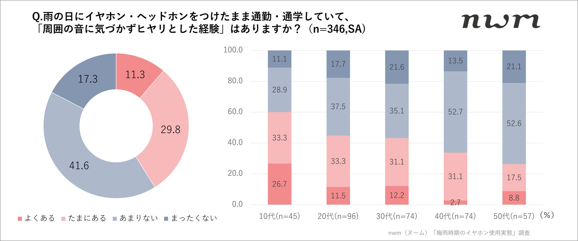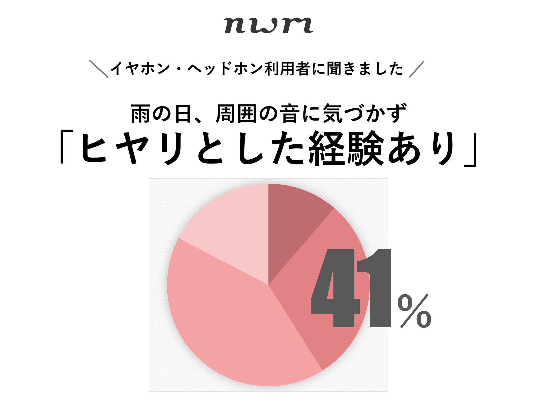 このように、雨の日は特にイヤホンによる聴覚の遮断による危険性が高まります。また、傘による視界の遮りも相まって”ダブルの死角”が生まれやすく、実際に「ヒヤリとした経験」を持つ人も一定数いることがわかりました。