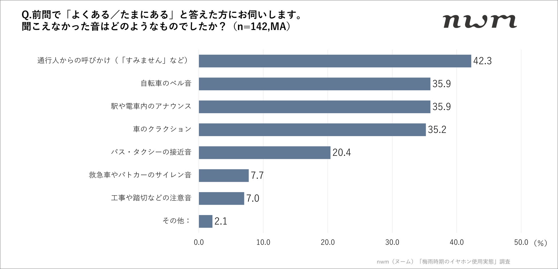周囲の音が聞こえてよかった場面として「駅のアナウンスが聞こえて乗り過ごさずに済んだ」「通行人や店員の呼びかけにすぐ反応できた」「後方からの自転車や車に気づけた」が多く選ばれており、“耳をふさがない”という構造そのものが、安全性の実感と結びついていることがわかります。聞こえることで守られる安全性が改めて意識される中、耳をふさがずに音を届けるnwmの“耳スピ”は、日常に潜むリスクに対応するための有効な選択肢のひとつとなり得ます。今後も、生活者の行動見直しの後押しにつながる啓発や施策を実施してまいります。