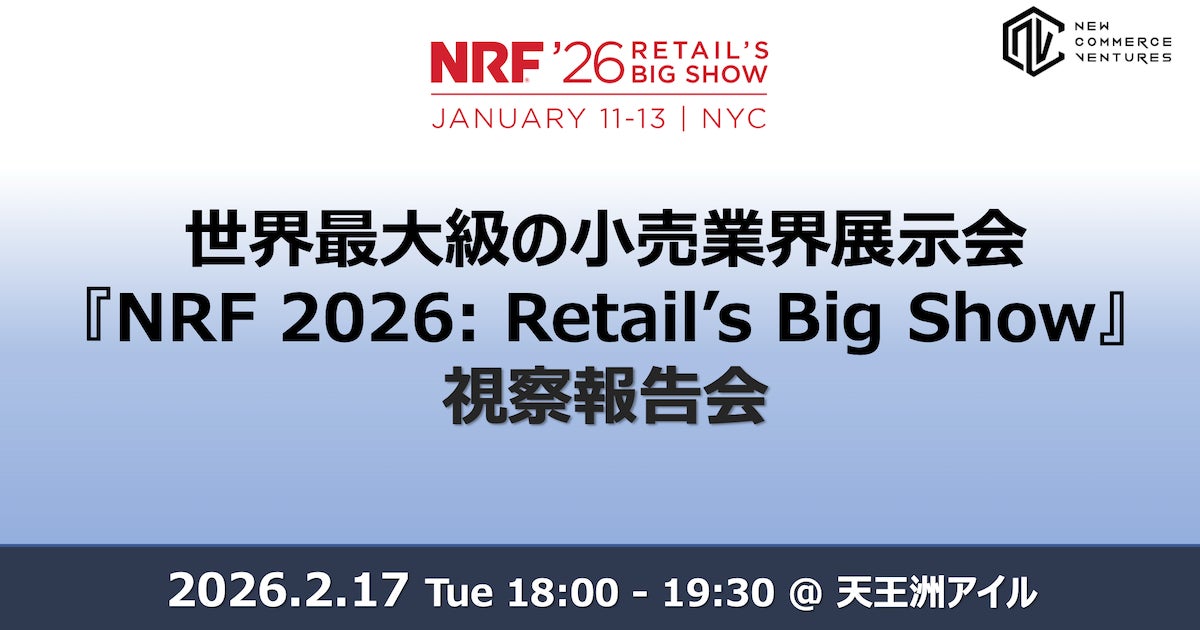 コマース・リテール領域のインダストリーベンチャーキャピタルNew Commerce Ventures株式会社(本社:東京都品川区、代表取締役:松山馨太・大久保洸平)は、2026年1月11日〜13日にニューヨークで開催された世界最大級の小売業界展示会「NRF 2026: Retail’s Big Show」の視察で得た最新トレンドを共有する報告会を開催いたします。