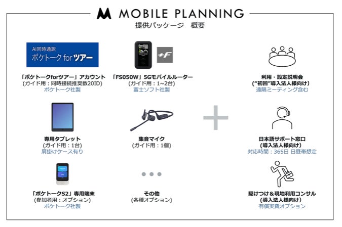 AI 同時通訳「ポケトーク for ツアー」の基本サービスアカウントをはじめ、参加者側が常に多言語でコミュニケーションを取れるようにAI通訳機「ポケトーク S2(専用端末*1)」のレンタルも実施いたします。加えて、ガイドとツアー参加者が利用可能な富士ソフト製5Gモバイルルーター「+F FS050W」、ガイド用のタブレット、そして集音マイクなどの周辺機器もレンタルを実施いたします。また、導入後の各種サポート体制も充実させ、モバイル・プランニング社と協業して販売から利用開始までのサポートを一括で提供いたします。