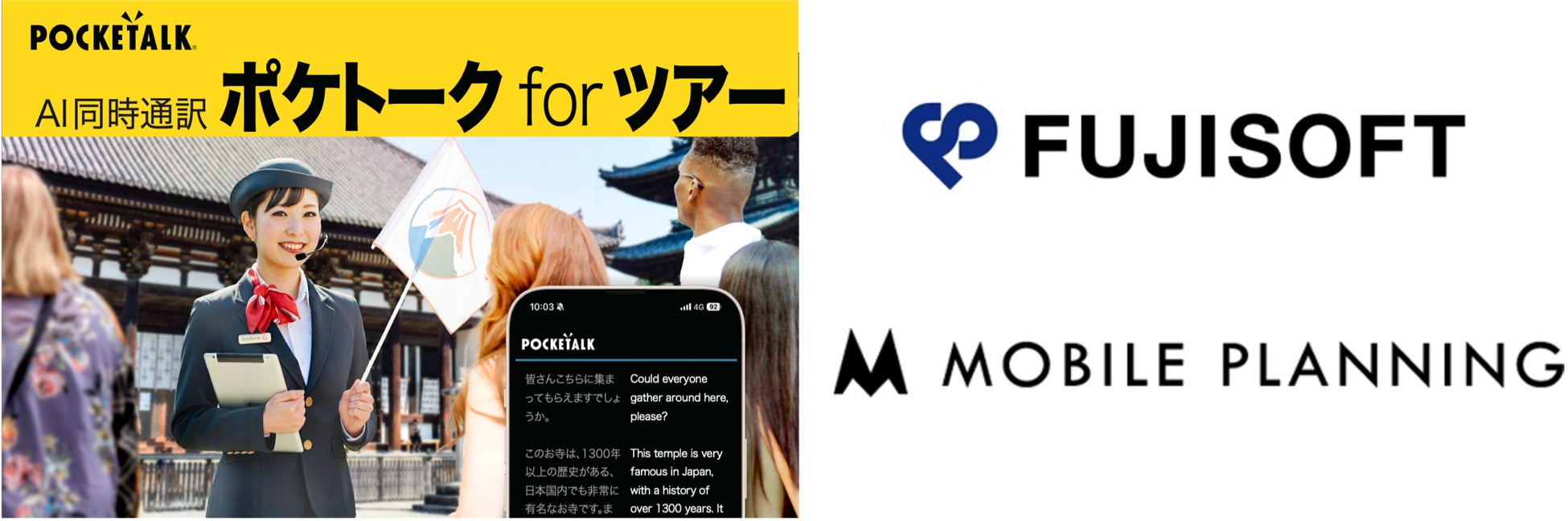 ポケトーク株式会社(本社:東京都港区芝二丁目2番12号 浜松町PREX4階 代表取締役社長:若山 幹晴)は、インバウンド対応および観光ツアーをターゲットにした新たなサービス、AI同時通訳「ポケトーク for ツアー」のレンタルおよびサブクスプランの販売を、富士ソフト株式会社(以下、富士ソフト)と株式会社モバイル・プランニング(以下、モバイル・プランニング)と協業し、本日より販売開始することをお知らせいたします。